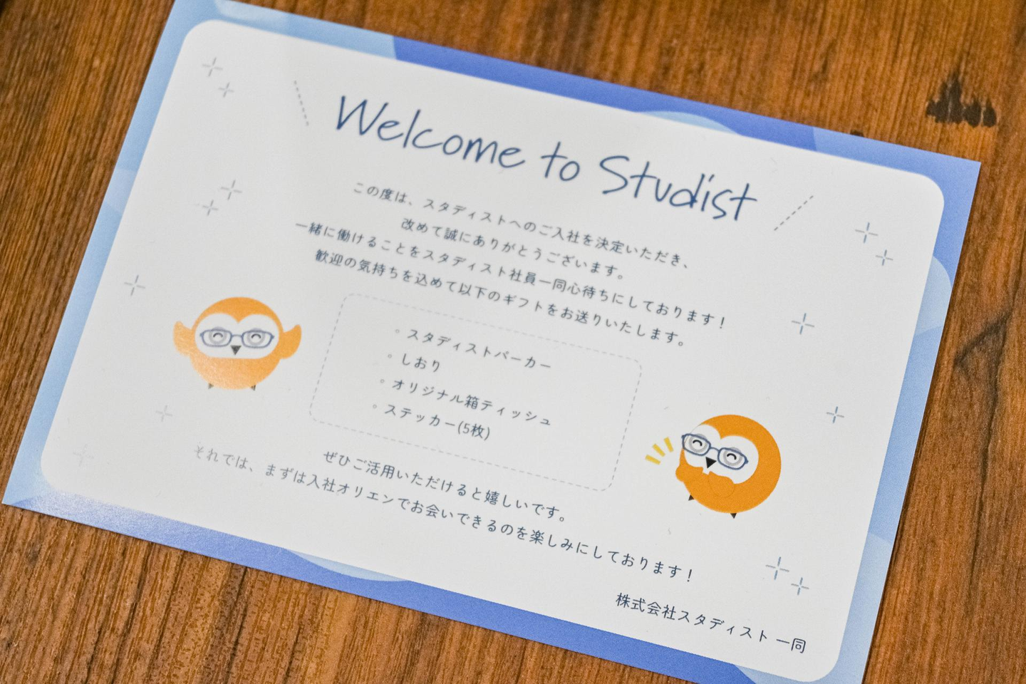 スタディストでは昨年7月から中途入社メンバーに向けて歓迎の気持ちを伝えるべく、スタディストオリジナルノベルティの詰め合わせBOXを配布しています。