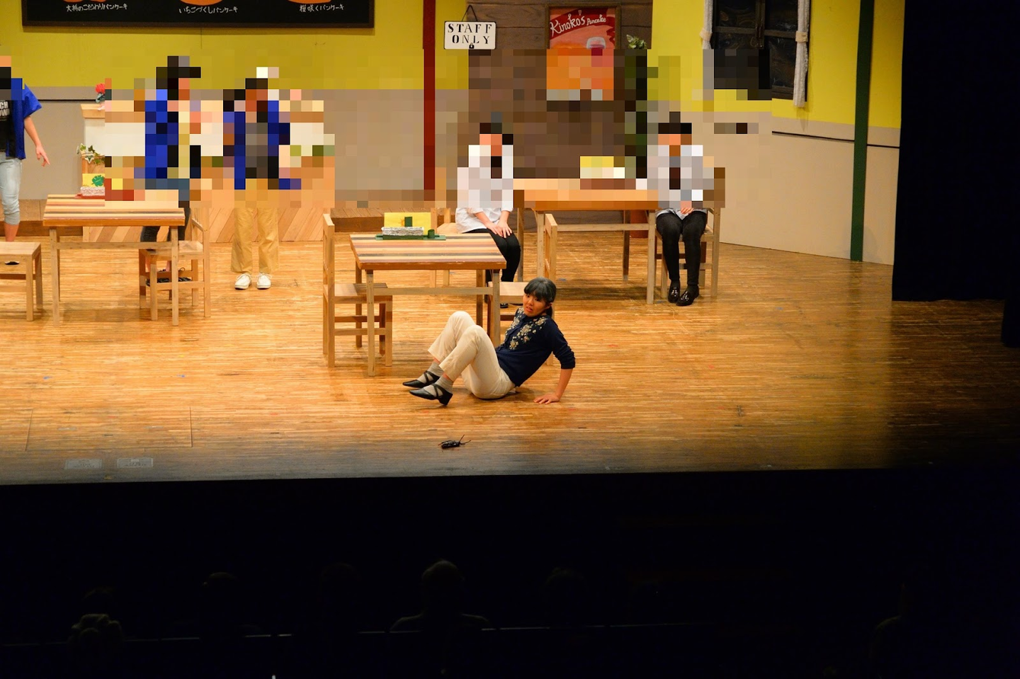 高校演劇部時代のお気に入り写真です。おもちゃのゴキブリに腰を抜かす中年女性を演じています