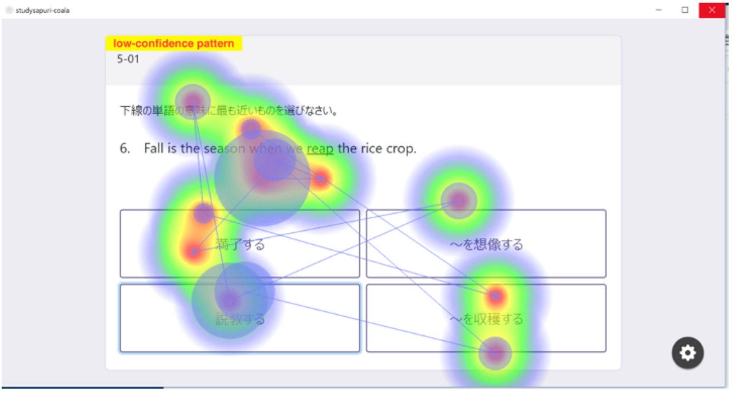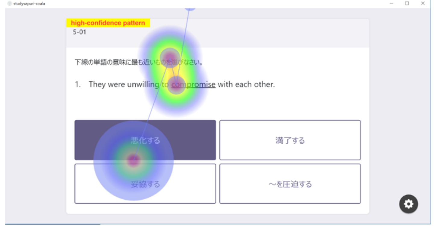 英単語の意味を答える問題をPC上で解いてもらった時の目線の動きをヒートマップと経路として表示したものです。