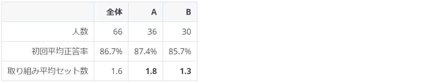 AとBの生徒で取り組んだセット数を比較した結果、以下の表のようにAの方がBよりも平均して1.4倍ものセット数に取り組んだことがわかりました。