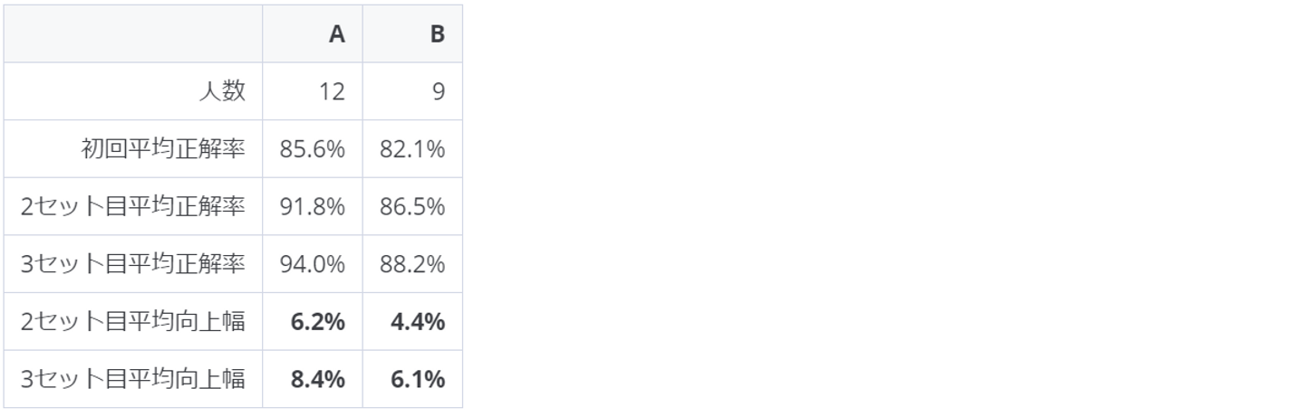 (※ 2セット目平均向上幅 = 2セット目平均正解率 - 初回平均正解率。3セット目平均向上幅 = 3セット目平均正解率 - 初回平均正解率。向上幅をAとBで比較すると、6.2 / 4.4 ≒ 1.4, 8.4 / 6.1 ≒ 1.4。)