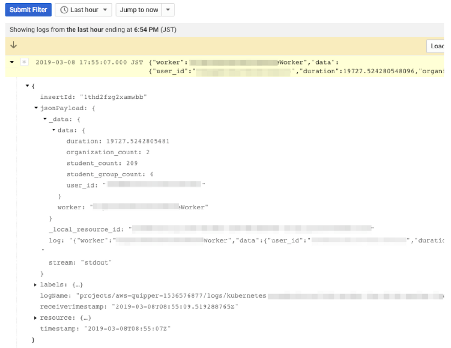 Rails.logger.info(log_data.to_json)worker には Resque worker のクラス名、durationには処理時間のミリ秒数を持っています。