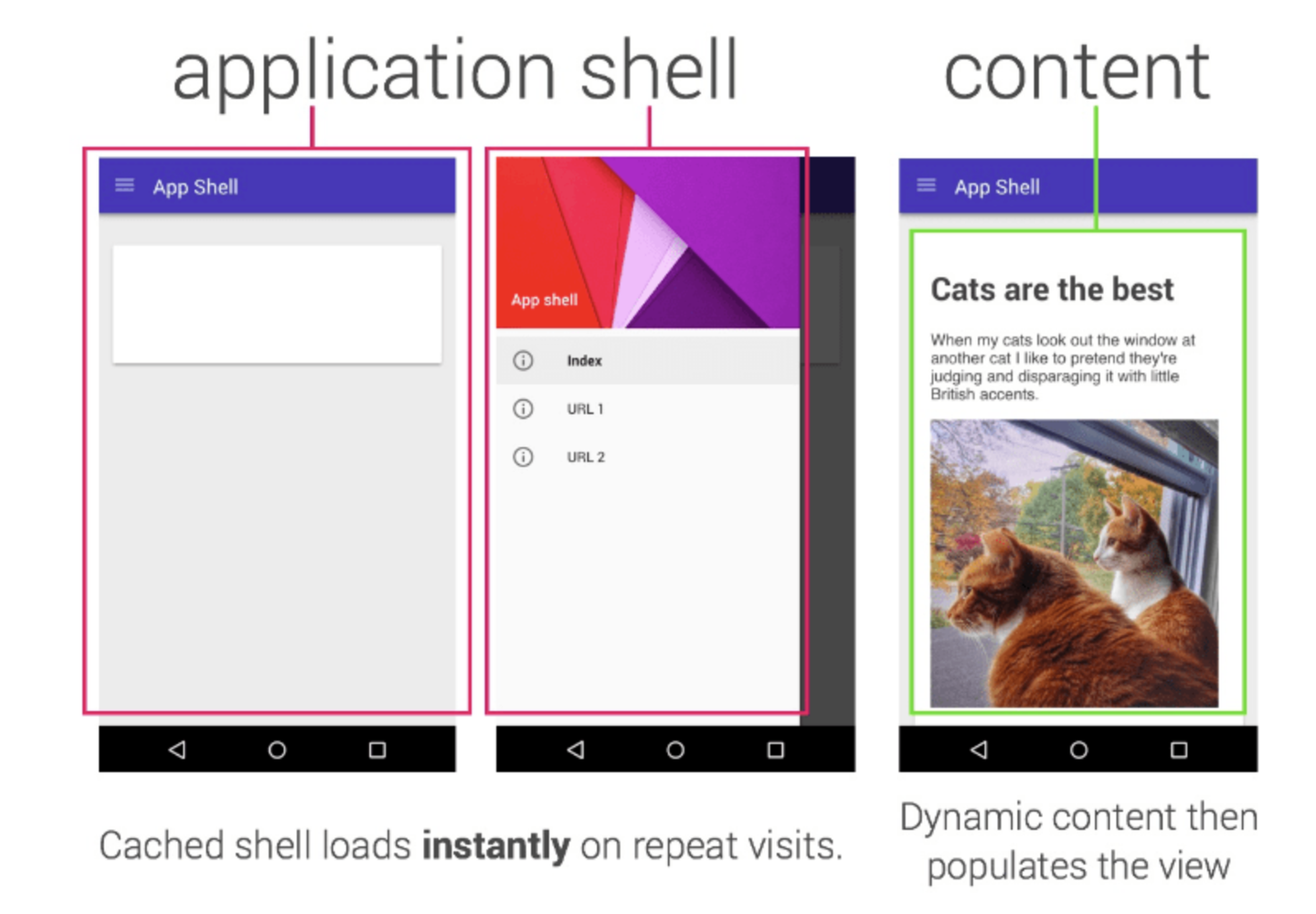 App Shell アーキテクチャは、ナビゲーションには比較的変更がなく、コンテンツが変更されるアプリやサイトに最適です。