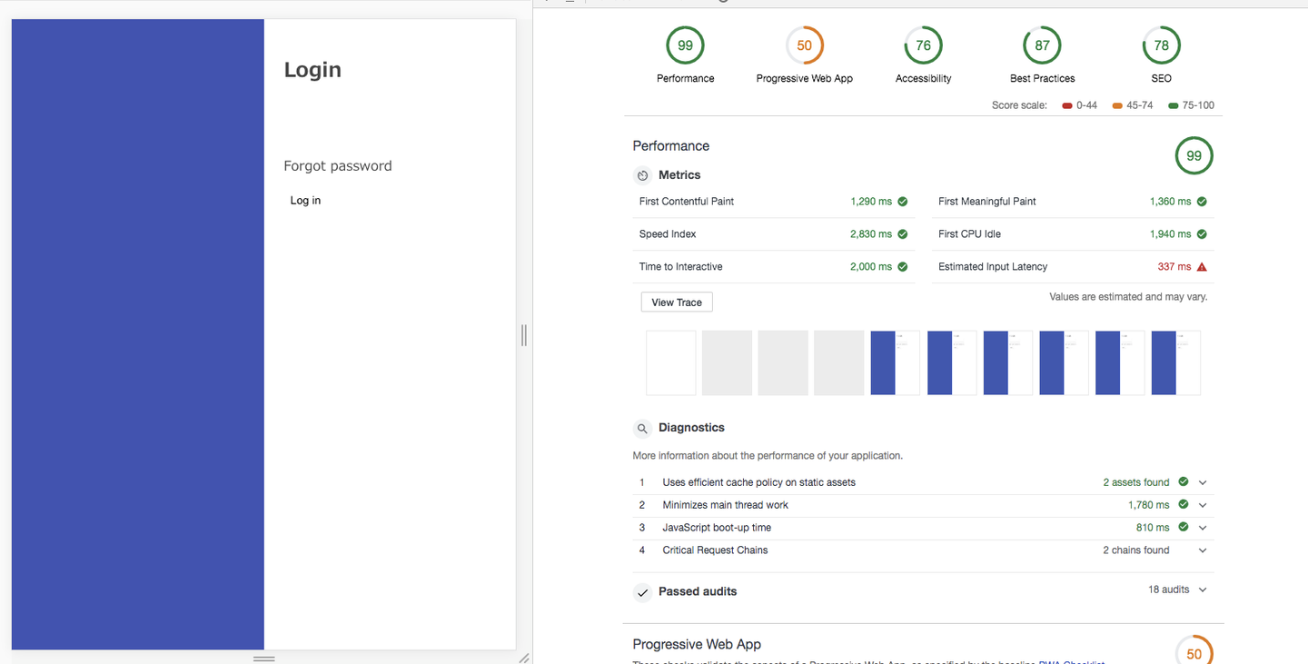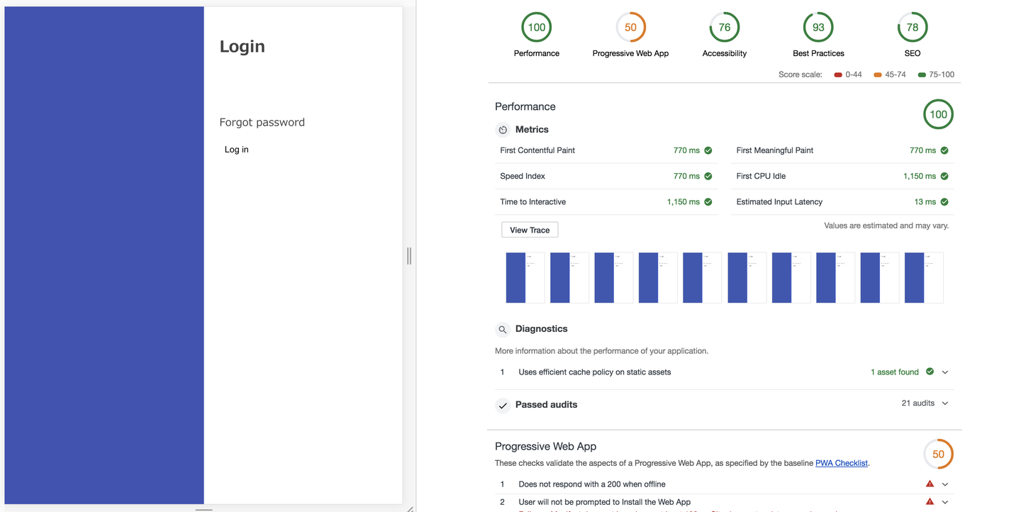 基本的にはログイン画面でその後の画面で必要になる JavaScript や CSS などをすべて precache しています。Webpack4 の maxsize option も使って HTTP/2 のメリットを享受しています。(ただ HTTP/2 が使えないブラウザに関しては、やはり遅くなってしまうので利用率を鑑みながら、Browser based build/bundles が必要になってくるかもしれません。)