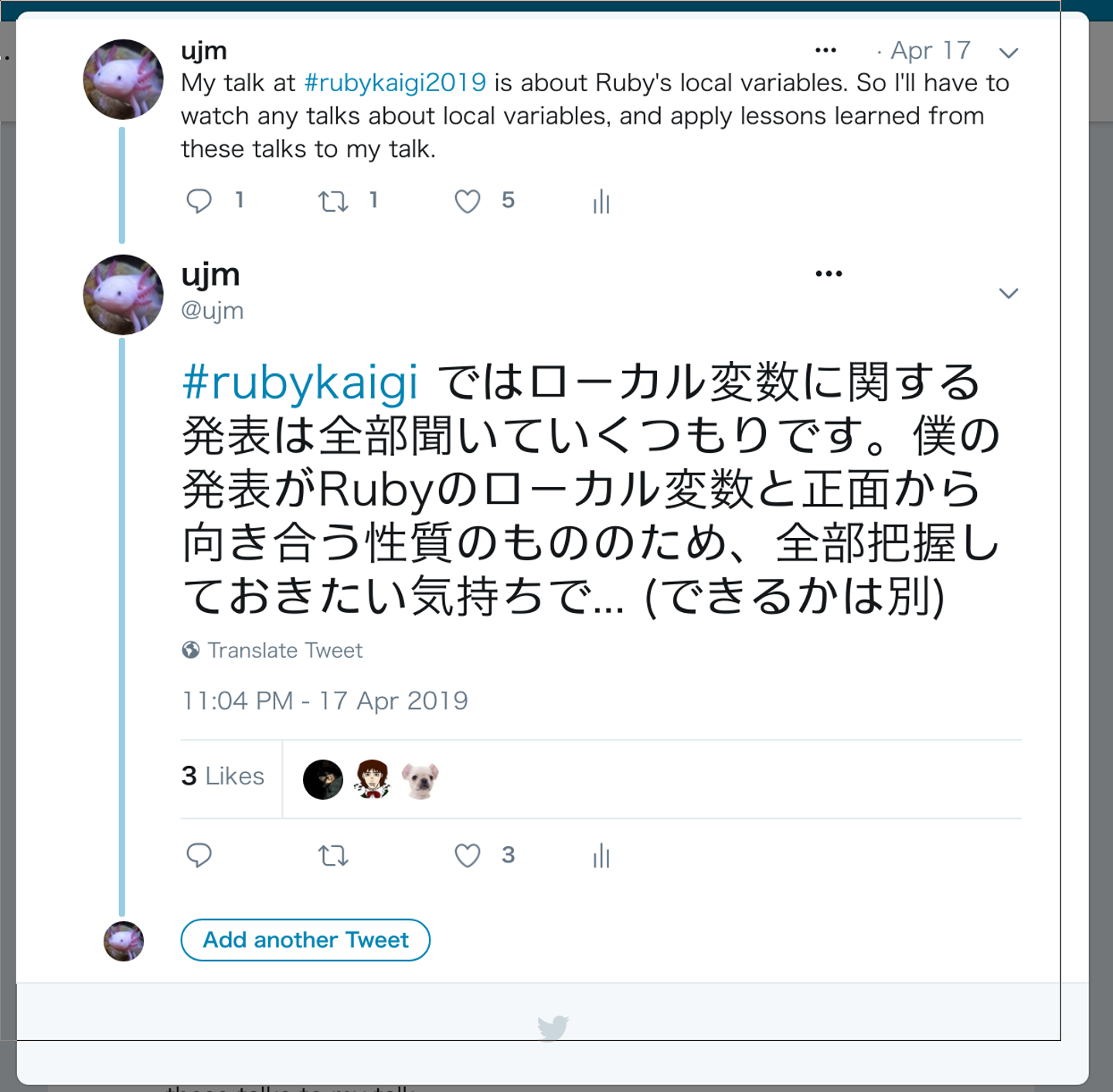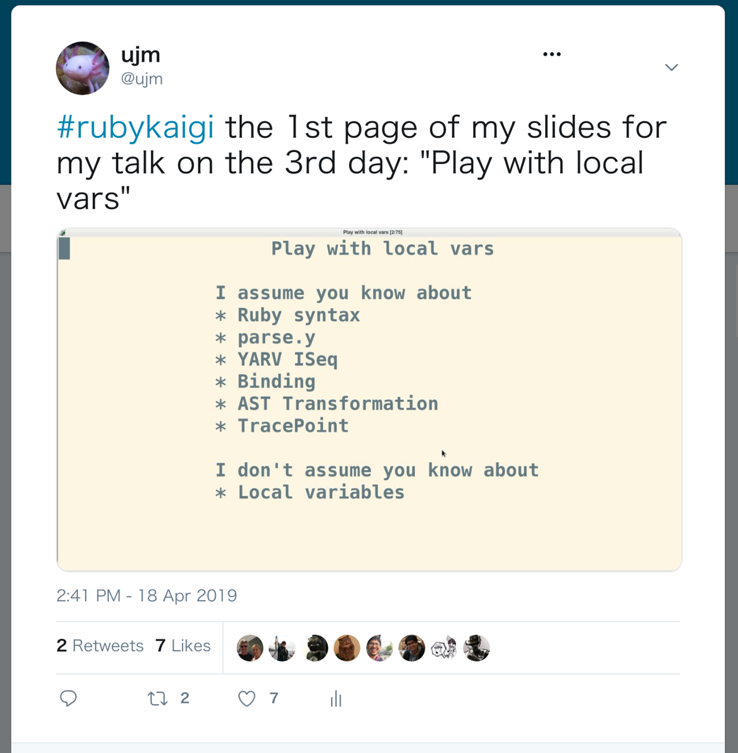 ujihisaです。先日2019年4月に日本の福岡で開催されたRubyKaigi 2019にて、ujihisaが "Play with local vars"というタイトルで発表してきました。この発表は、40分間英語でひたすらRubyのローカル変数についてだけ語るというものです。