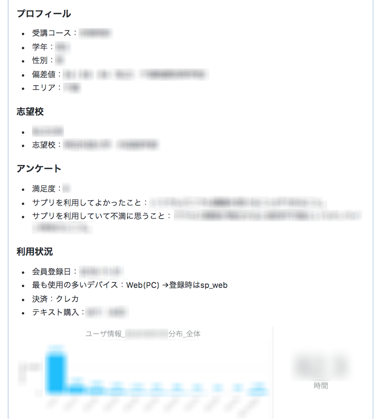 ユーザーインタビュー実施前には、予め対象者のプロフィールを調べておきます。定性だけでなく定量データも記載して、そのユーザーにまつわる情報をすぐに把握できるようにまとめています。