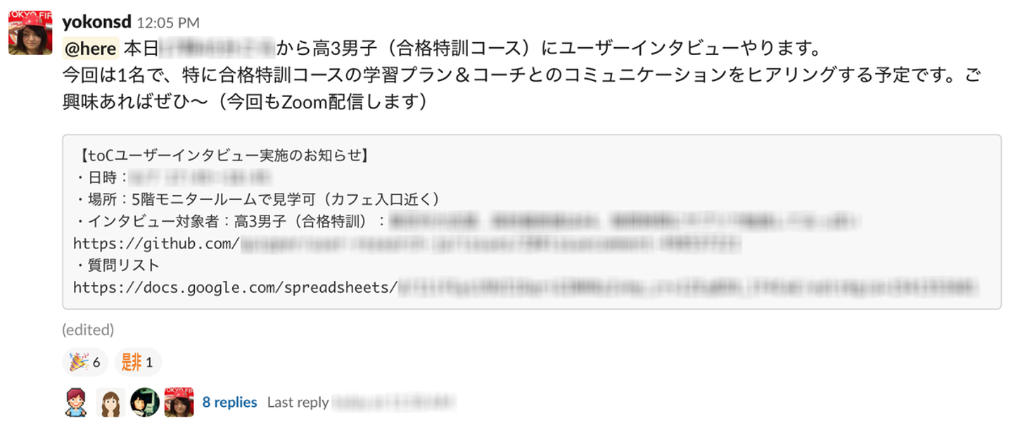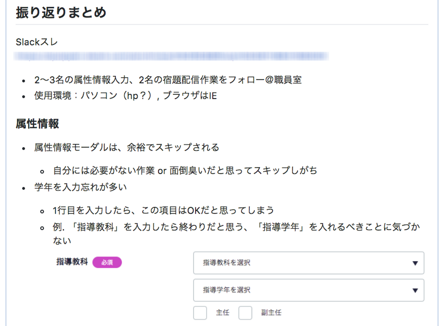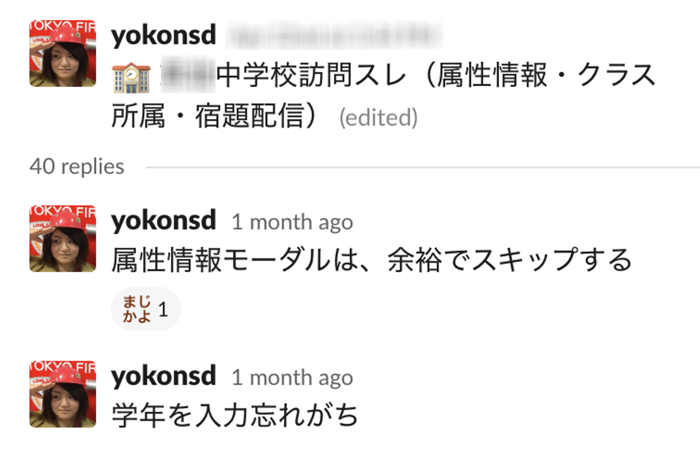 学校訪問の場合では、ユーザーが画面操作している様子を観察したら、帰りの道中でSlackスレッドに議事録や気づきを投稿します。