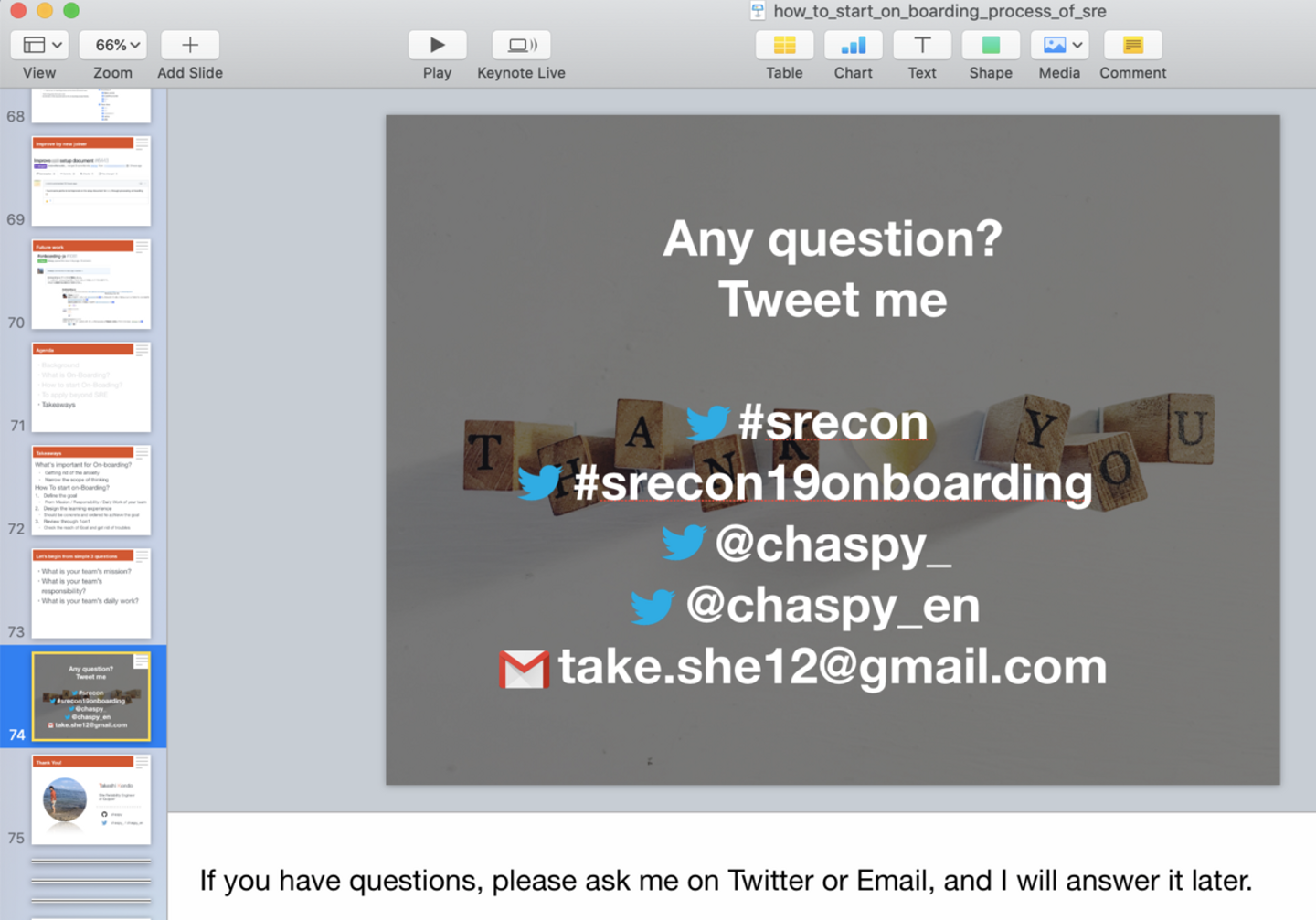 私の場合、発表の最後にこのように Account や Mail Address を表示し、If you have questions, please ask me on Twitter or Email, and I will answer it later.