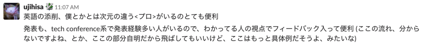 また、今回は英語の発表であったため、事前に Google docs で outline と talk scripts を anyone can comment の状態で公開しました。Quipper はNative相当の、プロレベルの英語力を持つメンバーが多く存在し、英語の指摘もほぼ無限にもらえるのもすごいところです。これらは Quipper の福利厚生と言えるでしょう。