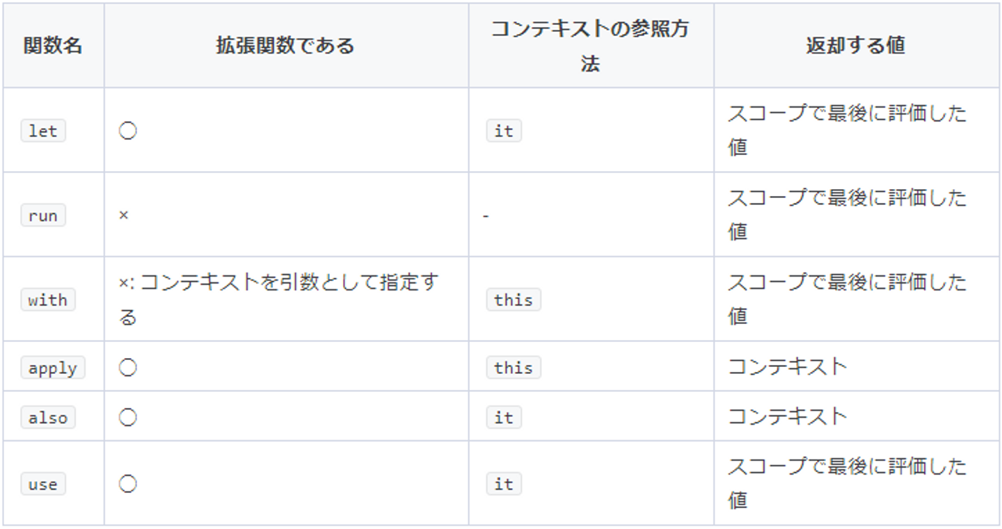 Kotlin の scope functions として紹介されているものはいくつかのタイプに分類することができます。
