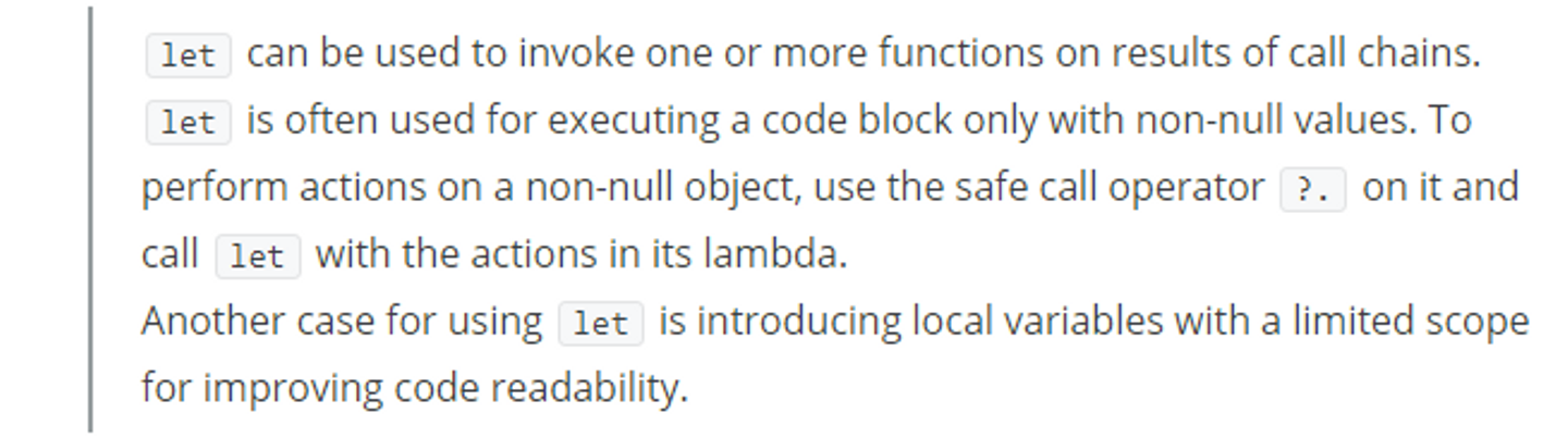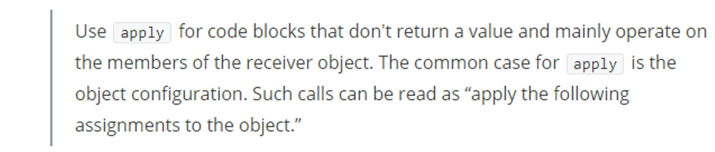 よーし、これで心置きなく scope functions を使えるぞ、と思っていた矢先、公式ドキュメント に不穏な(?)記述を発見しました。