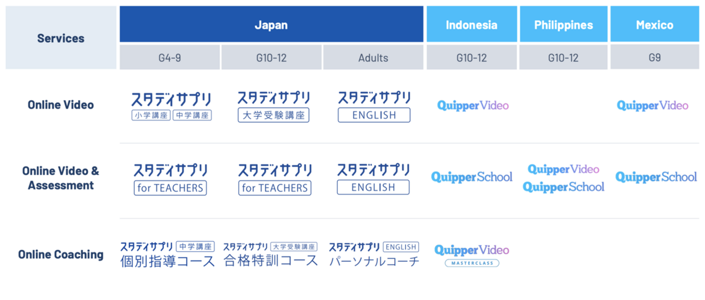 スタディサプリは「高校生が大学受験で使う勉強教材」というイメージが強いのですが、高校生だけでなく、社会人向けの英語学習アプリ、学校教師向けのICT教育支援ツール、オンラインでのコーチングサービスなど幅広いユーザーに様々な教育サービスを提供しています。