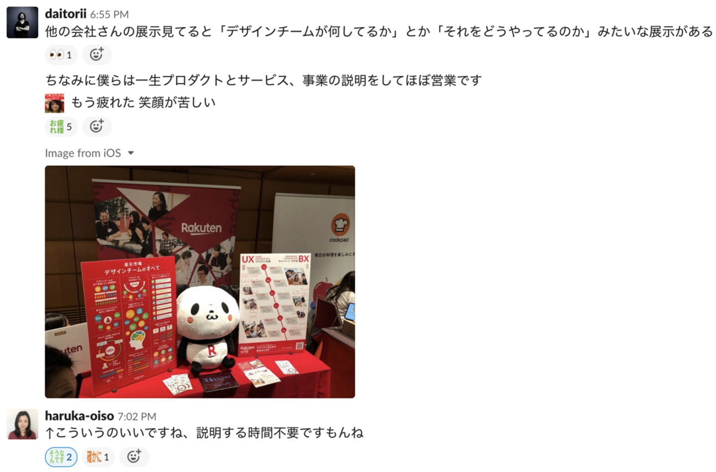 イベント当日はブースを運営する上での気づき、他社の展示からの学びをSlackに投稿して、「次回はこうしたほうがいいね」とみんなで改善案を考えていました。