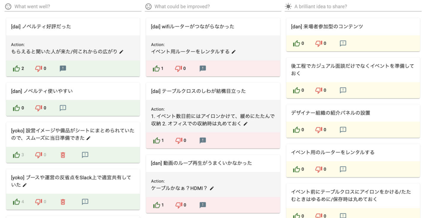 Designshipが終わった後は、その週のうちにブース運営メンバーでKPTをしました(retrospectedを使用)