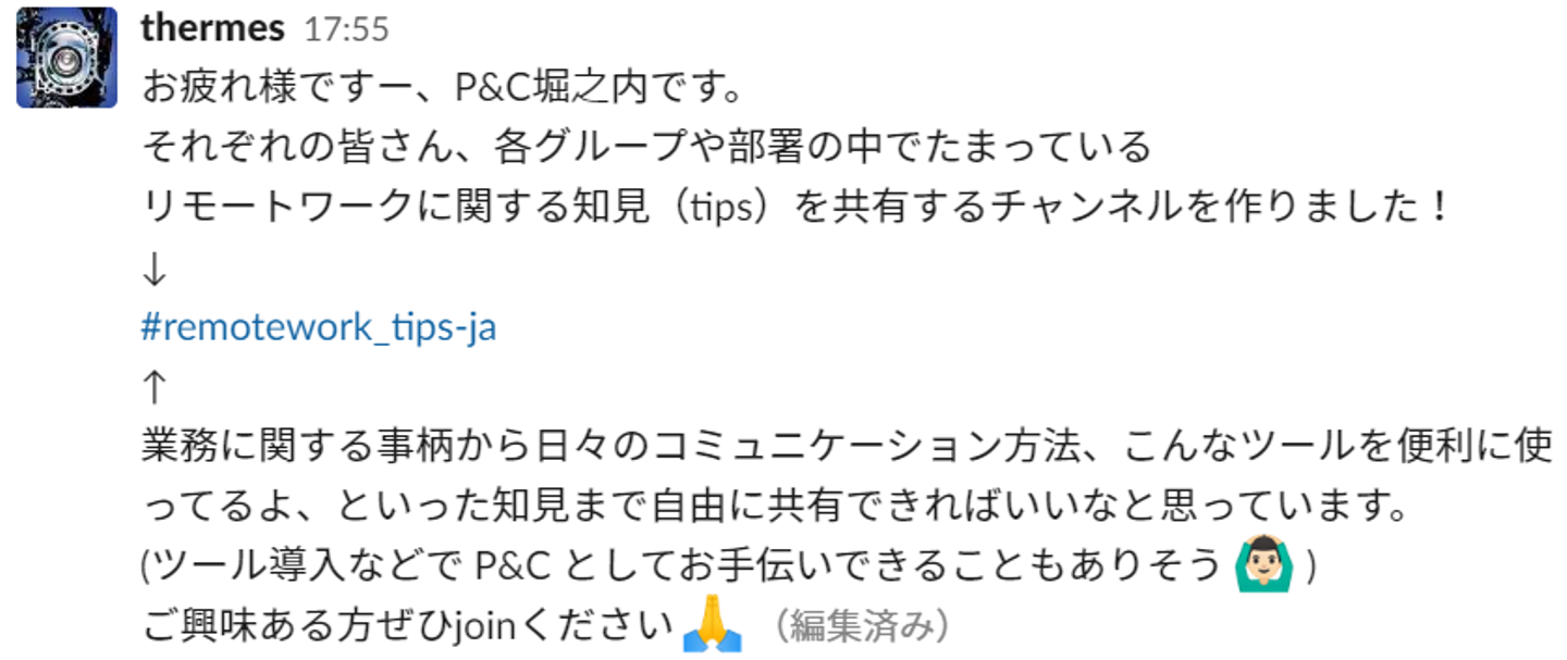 さらにはSlack内にリモートワークを行う上での知見をシェアするチャンネルも生まれ、おすすめのツールやデバイスなどの情報が行き交っています。