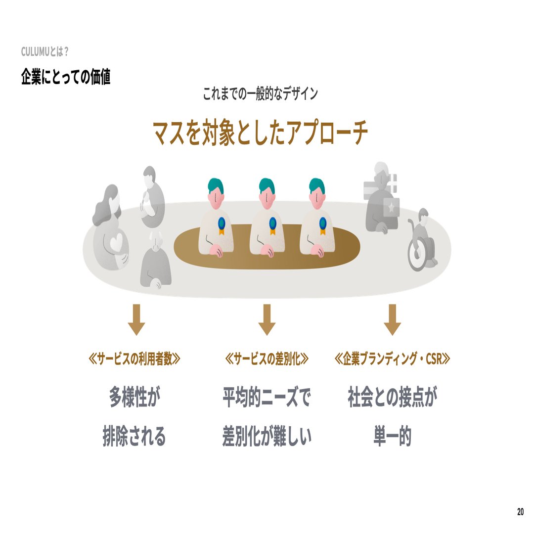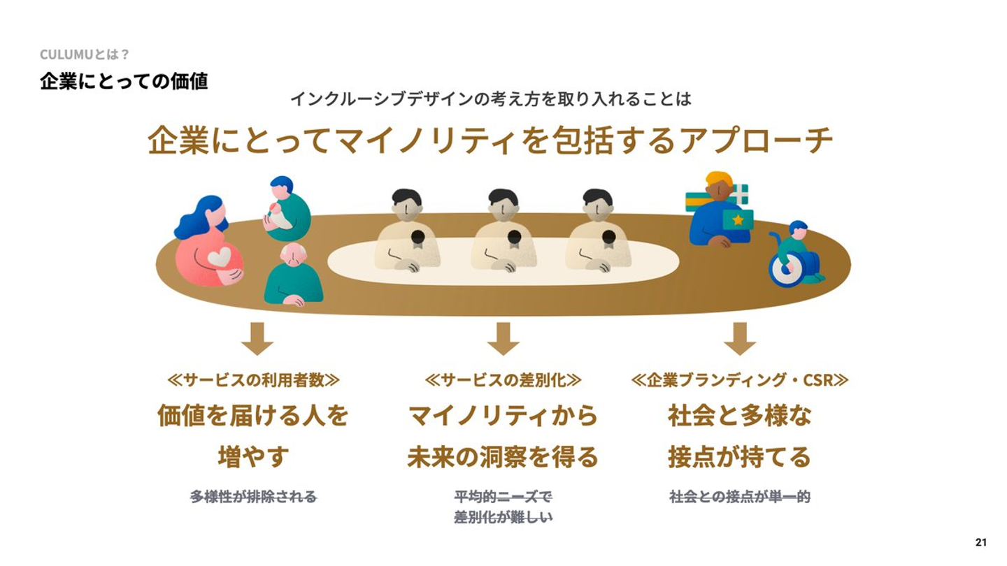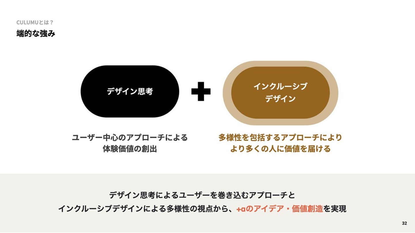 私たち「CULUMU」では、多様性から考えるデザインプロセスであるインクルーシブデザインと、デザイン思考によるユーザーを巻き込むアプローチの両輪をもって取り組み、+αのアイデア創出と、新しい価値創造を目指しています。