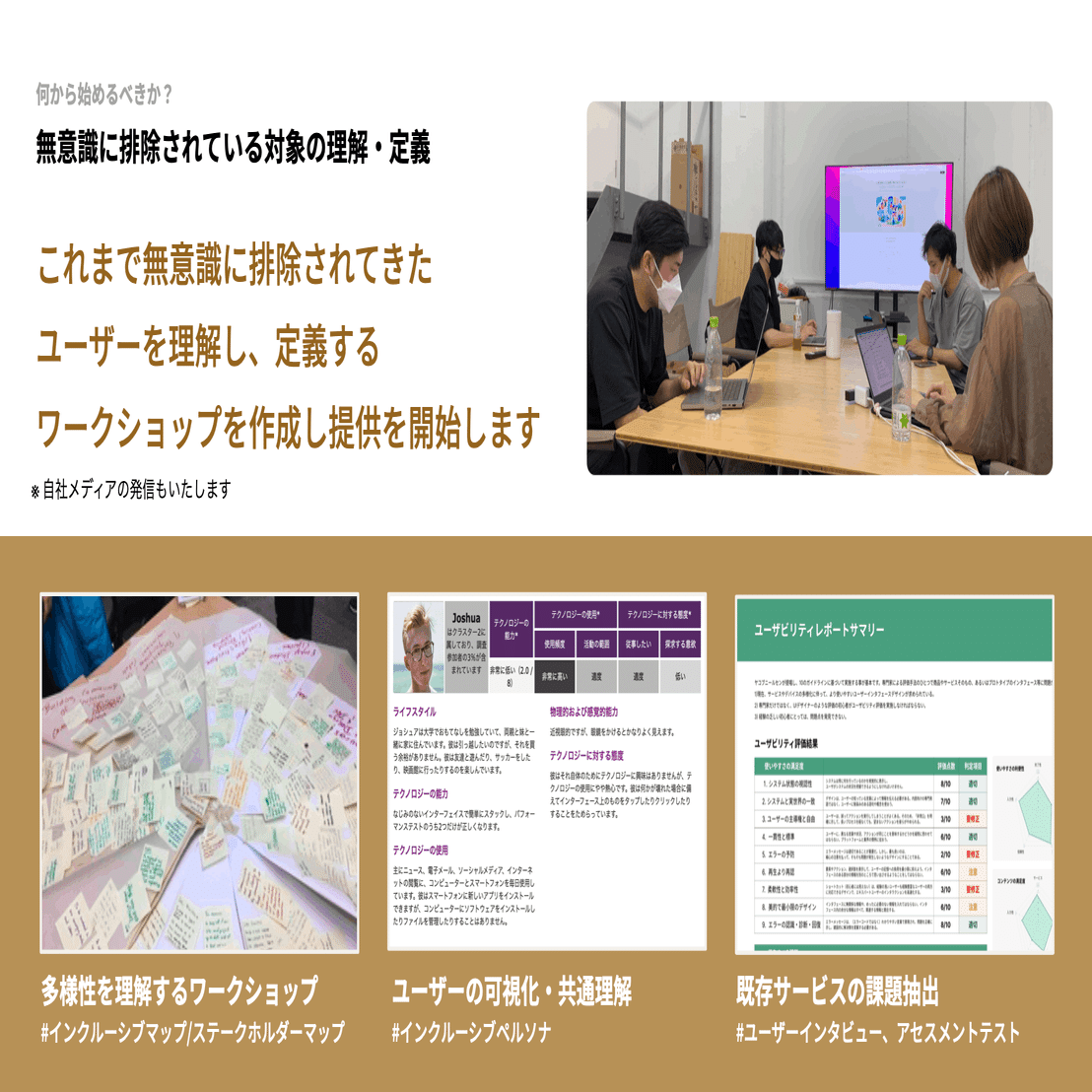 ワークショップを通じてインクルーシブデザインの考えや理解、具体的なアプローチを体験いただくことができます。サービス開発やプロダクト開発において、社会や人々の多様性を整理し、理解してからスタートするきっかけとなります。