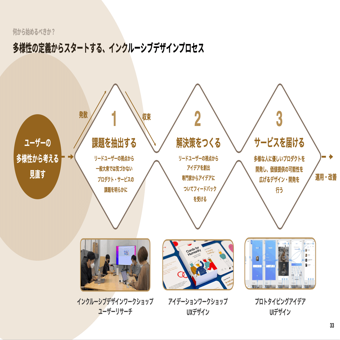 インクルーシブデザインの考え方を取り入れることにより、サービスの視野を広げ、価値を届けるユーザーを増やすだけでなく、超高齢社会や外国人労働者の増加、地方の過疎化などの課題にもいち早く対応し、今後の社会に求められるサービスやプロダクトを世の中に提供していくことが可能になると考えられます。結果として、サービスやプロダクトの差別化となるアイデアが得られるアプローチにもなり得るでしょう。