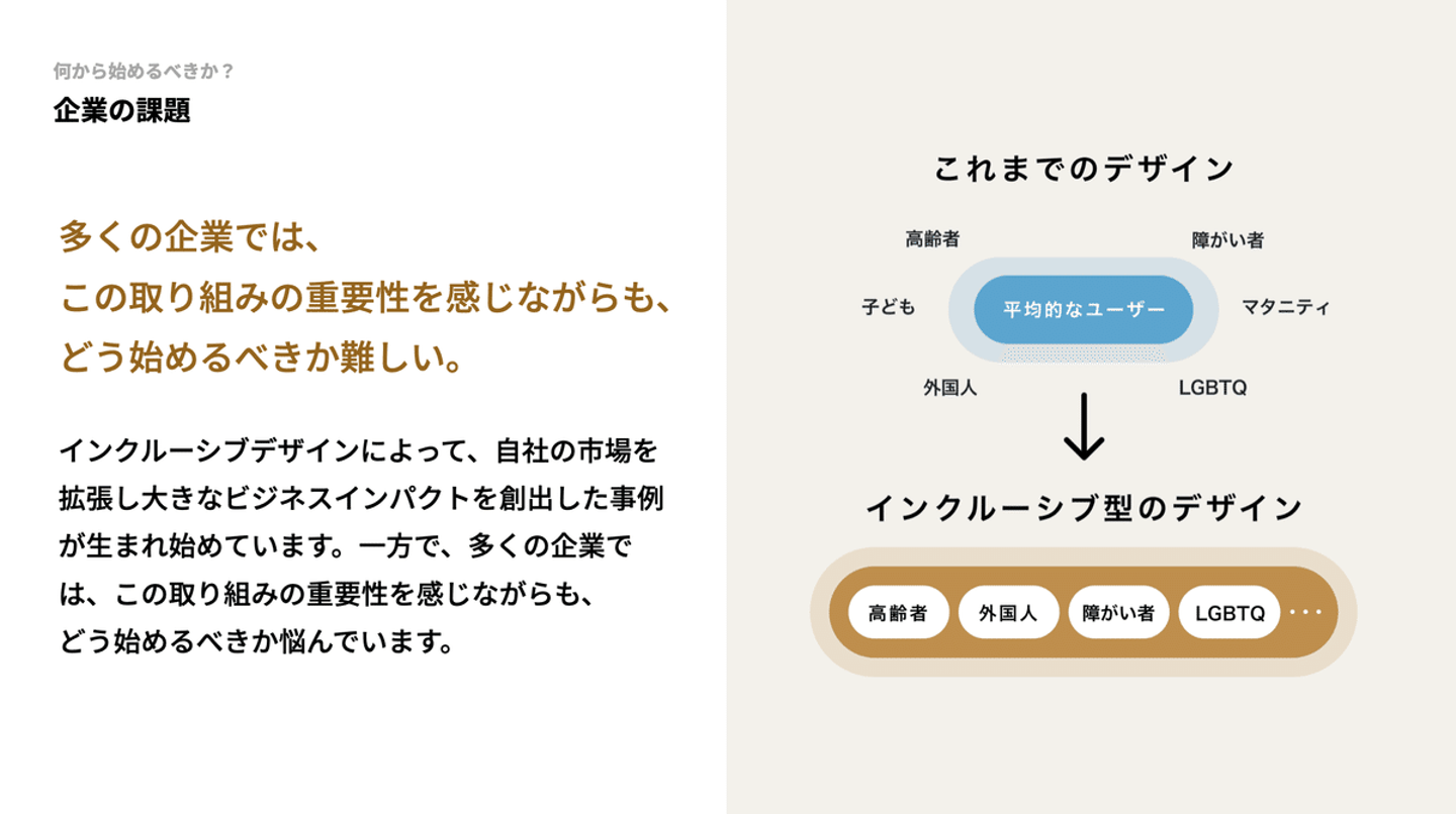 しかしながら、これらの事例やインクルーシブデザインのプロセスを知り、この取り組みの重要性を感じたとしても、実際取り組み始めるには難しい場合もあるのではないでしょうか。