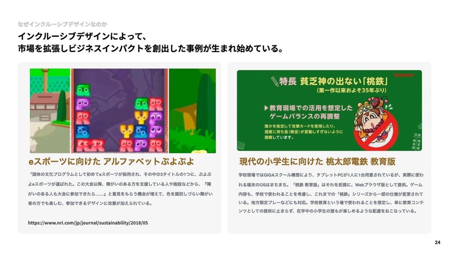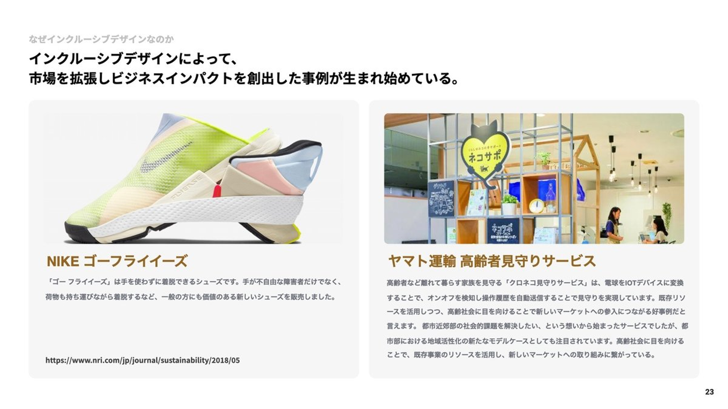 様々な課題が取り巻く日本において、インクルーシブデザインの手法を取り入れた事業やサービスはどんどん増加していくのではないでしょうか。実際、現在でもインクルーシブデザインの考え方に基づきビジネスインパクトを創出している事例も見受けられます。