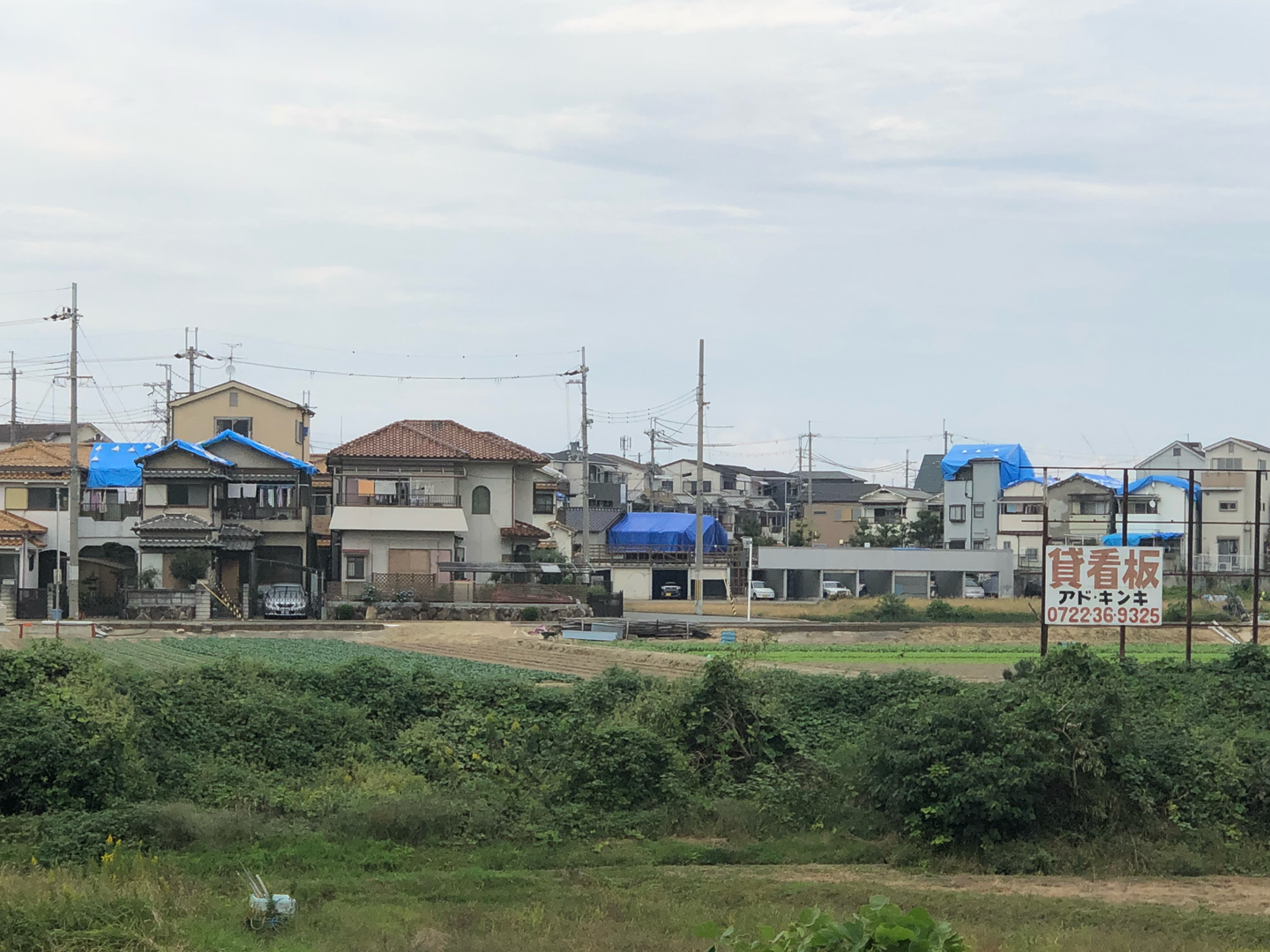 (この写真は、大阪の堺市周辺で撮ったものです。ビニールシートで応急処置されている屋根が何軒もありました。)