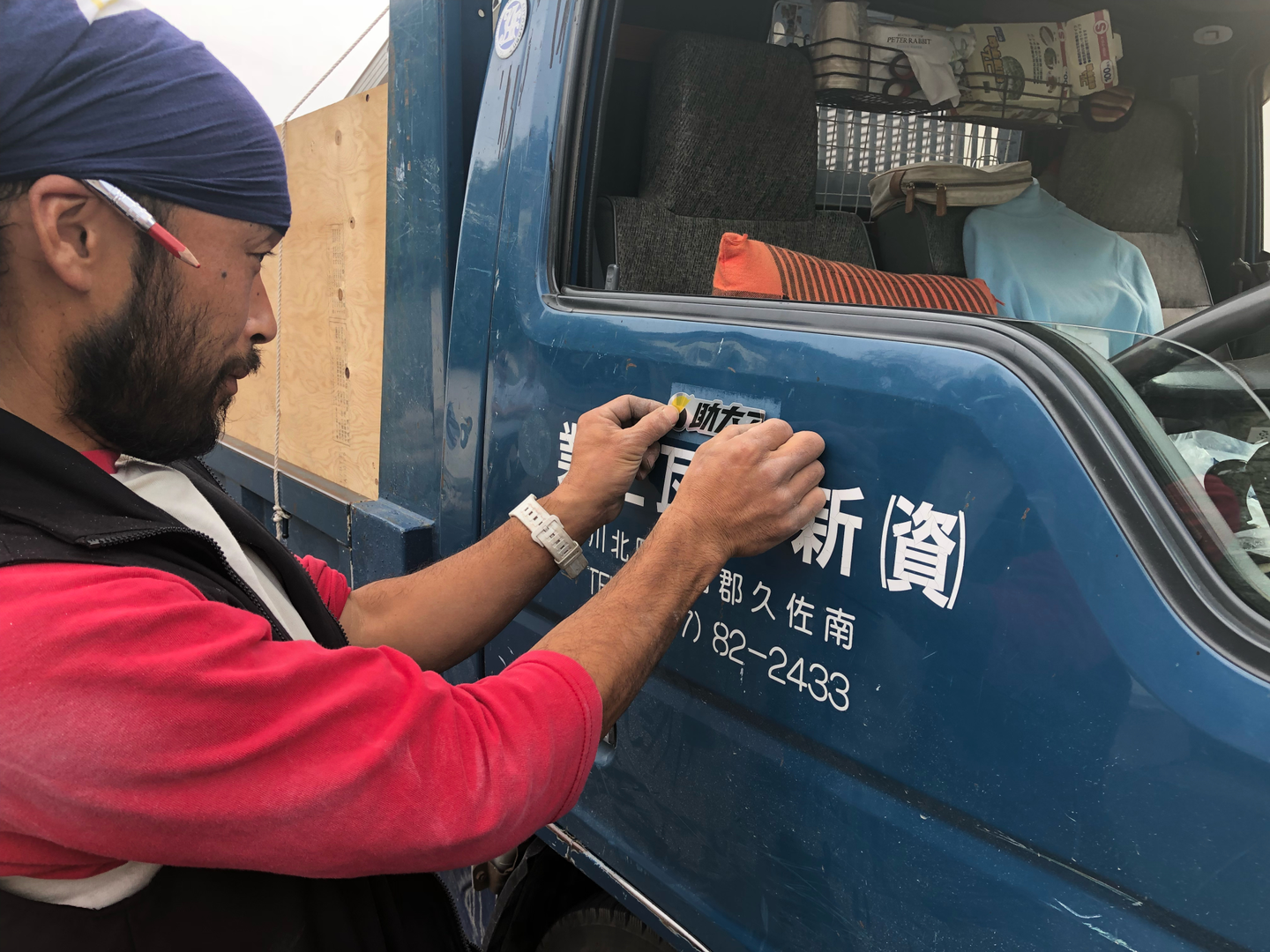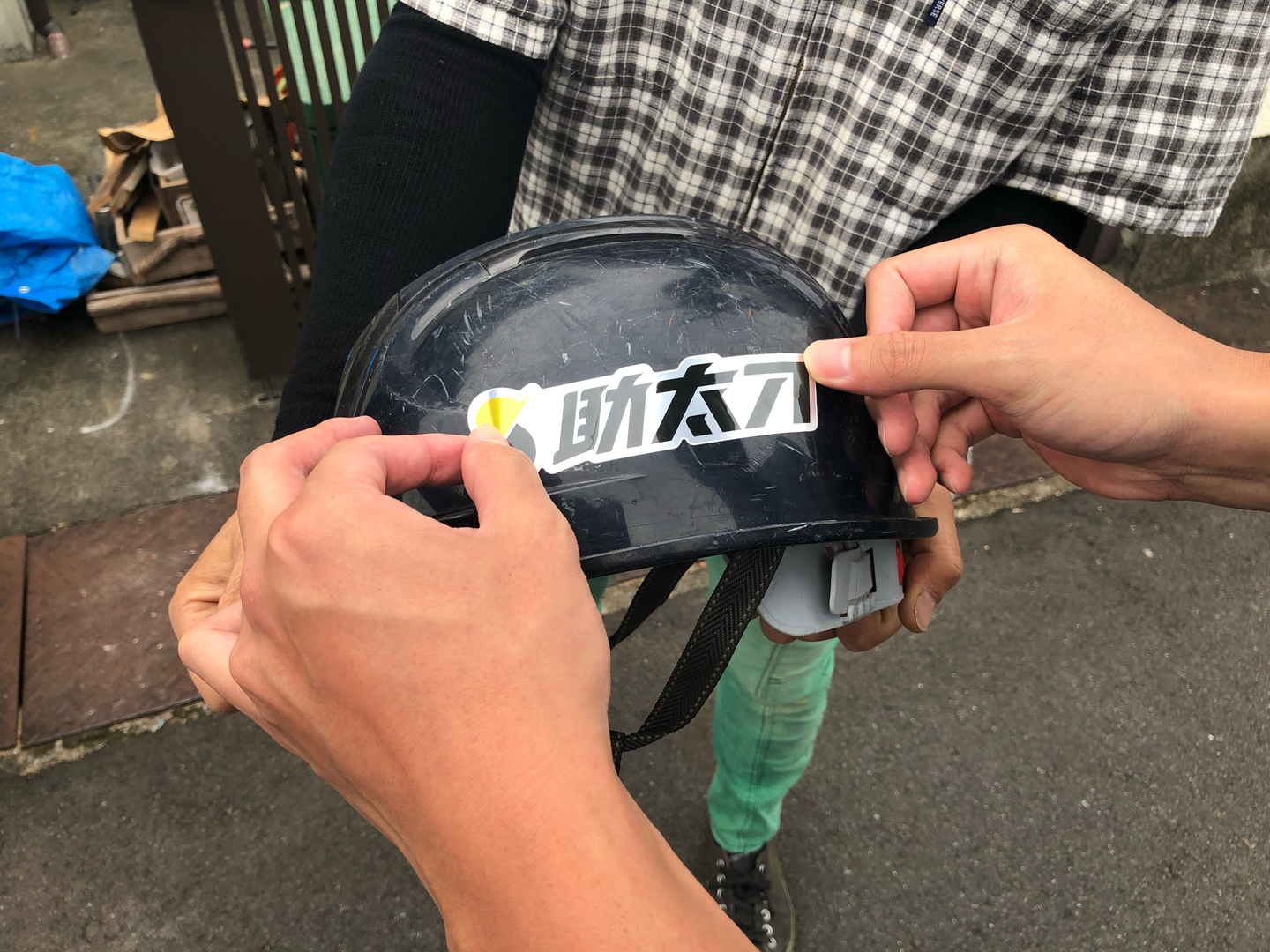 新海さんは助太刀のステッカーを気に入って下さり、普段仕事で使っているヘルメットと、なんと車にも貼ってくれました!!嬉しいですね!