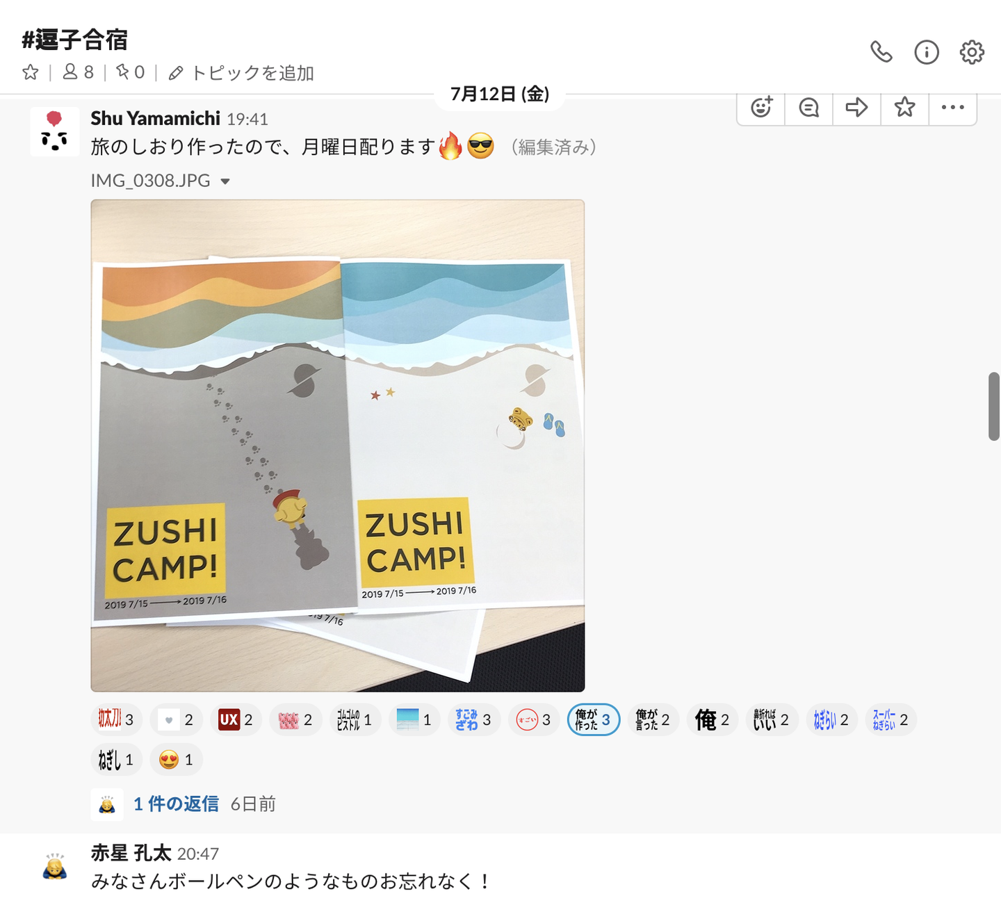 Slackの合宿チャンネルでやりとり。写真はデザイナー山道さんが作ってくれた合宿のしおり。