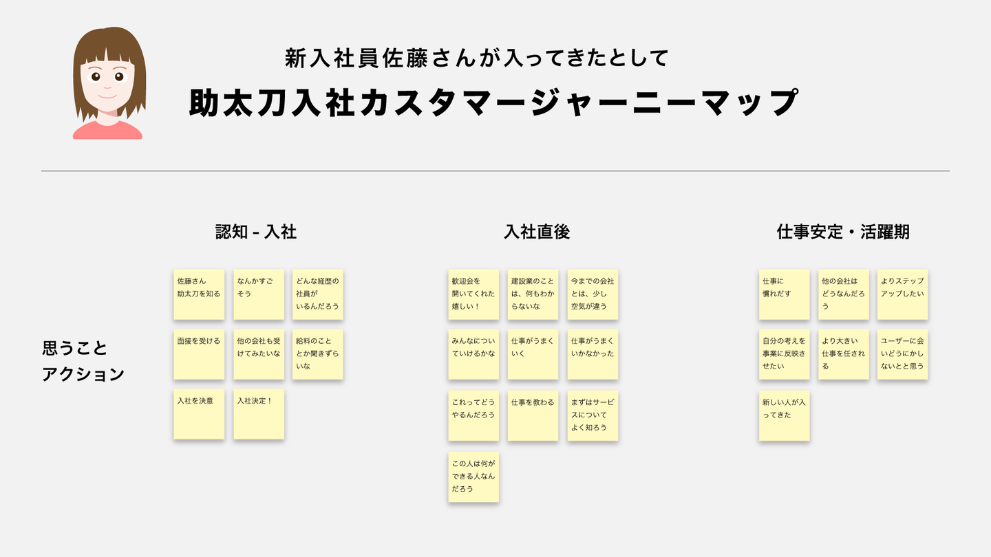 といったことを、認知→入社→入社直後→活躍期のプロセスごとに分け、カスタマージャーニーマップを作成しそれぞれごとに今の組織の課題、施策を検討しました。