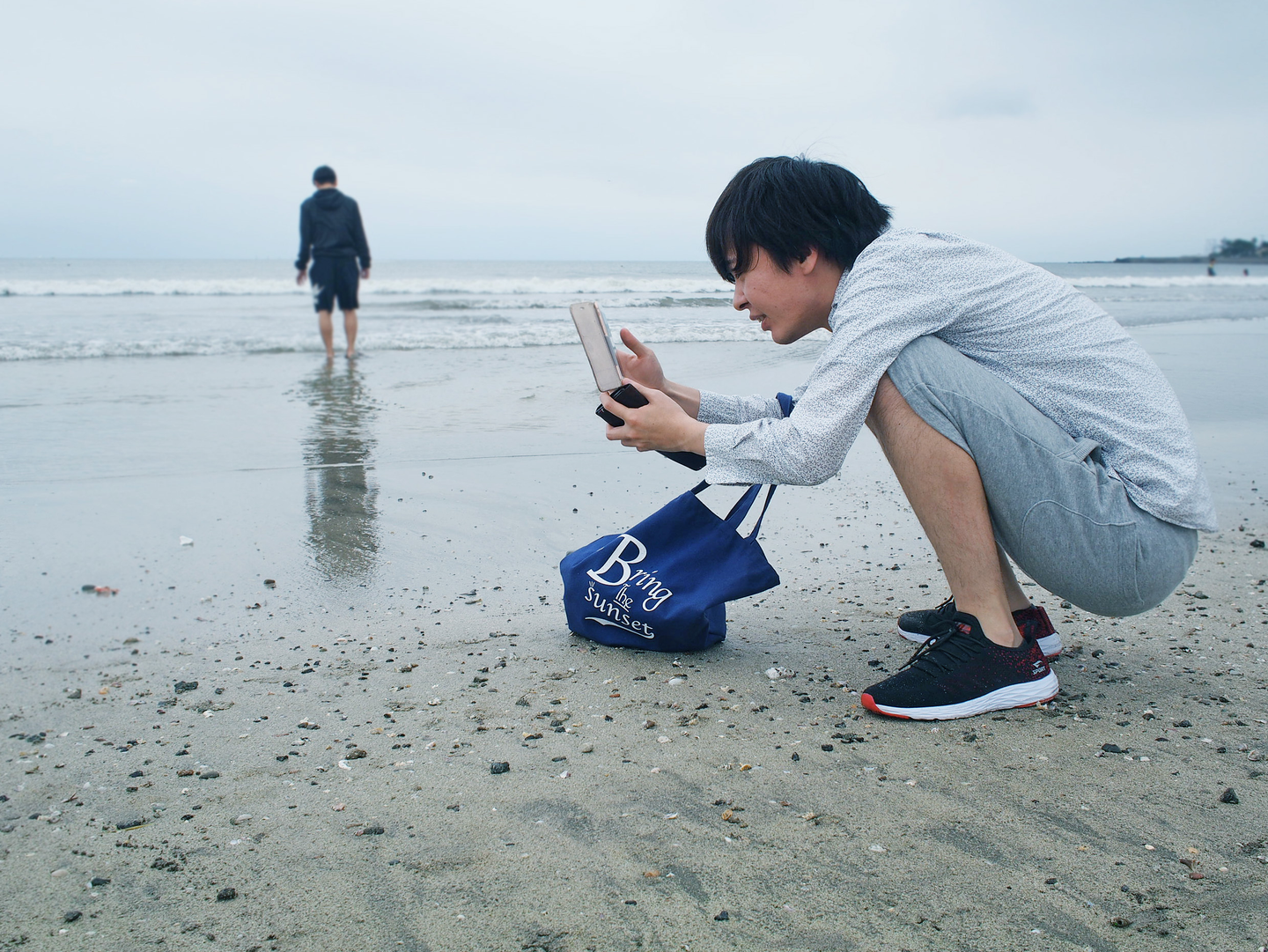 エンジニア赤星さん。この数秒後に波に襲われ、トートバグッグと靴がびしょびしょになります。