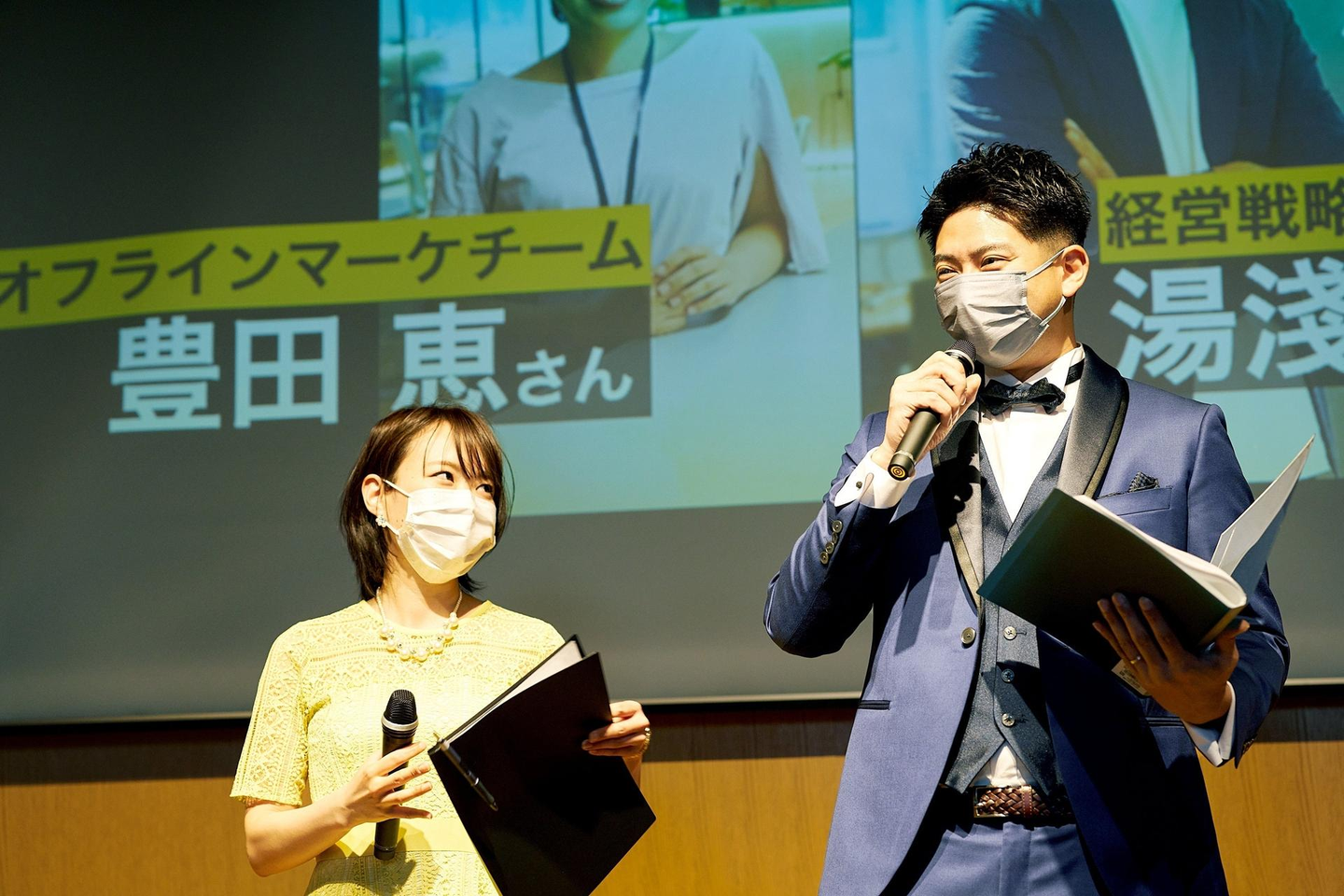 司会の登場! 司会は経営戦略グループの湯淺さんとオフラインマーケチームの豊田さんのコンビ!