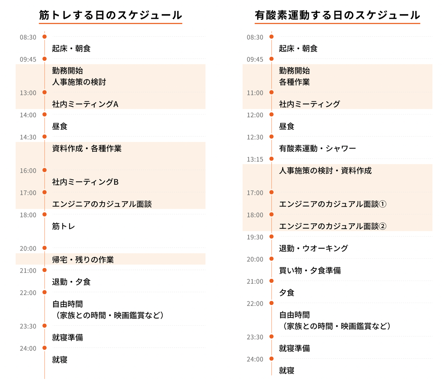 裁量労働制なので自分のタイミングでできる、ということをうまく活用して昼食前後に有酸素運動、退勤後はウオーキングを取り入れています。