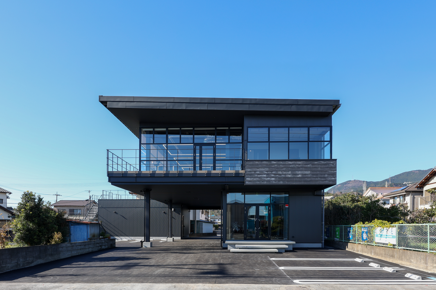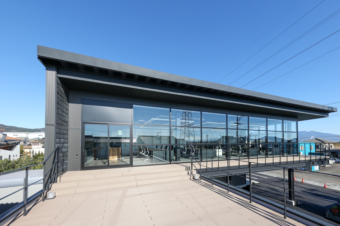 正面外観はこんな感じ!カフェのような建築デザインですが、このデザインには社長のある思いも詰まっています。そのお話は、また近いうちに…。