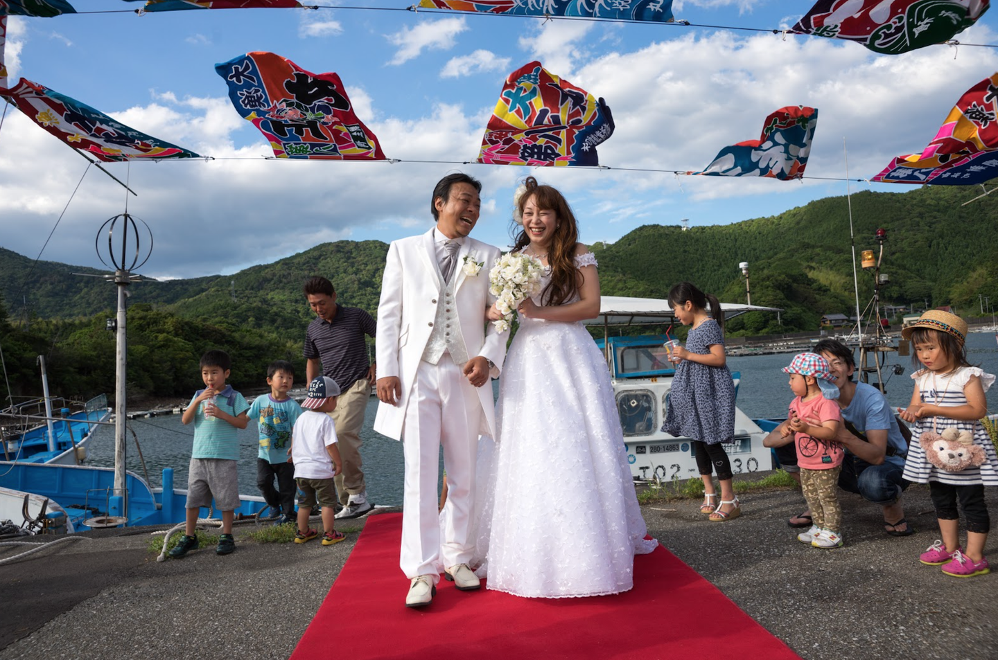 (写真:大阪から美波町に移住した美雲屋スタッフ。花嫁は漁船で登場!)