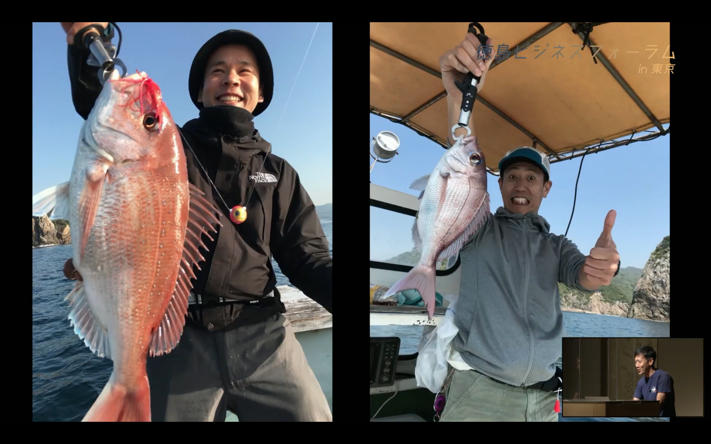 (写真:美波町の海へ釣りに出た代表鈴木とエンジニア。収穫した魚は大阪本社スタッフ家族のお食い初めのお祝いとして贈りました)