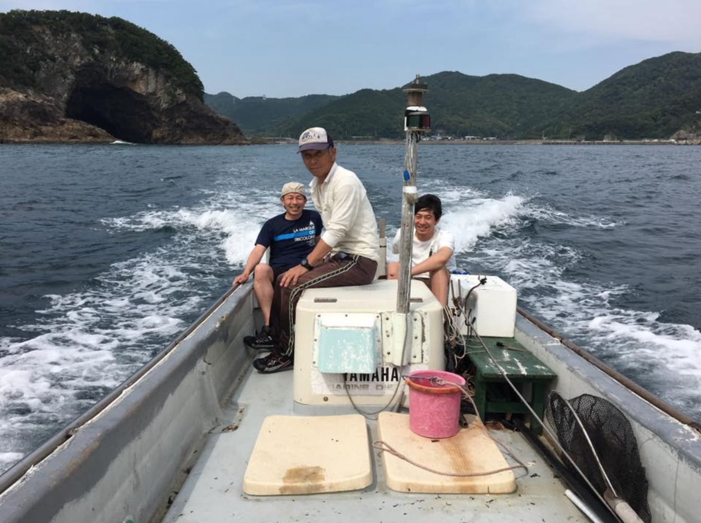 (写真:開発業務の合間に美波町の漁師さんの船に乗せて頂いて海に出るエンジニア)