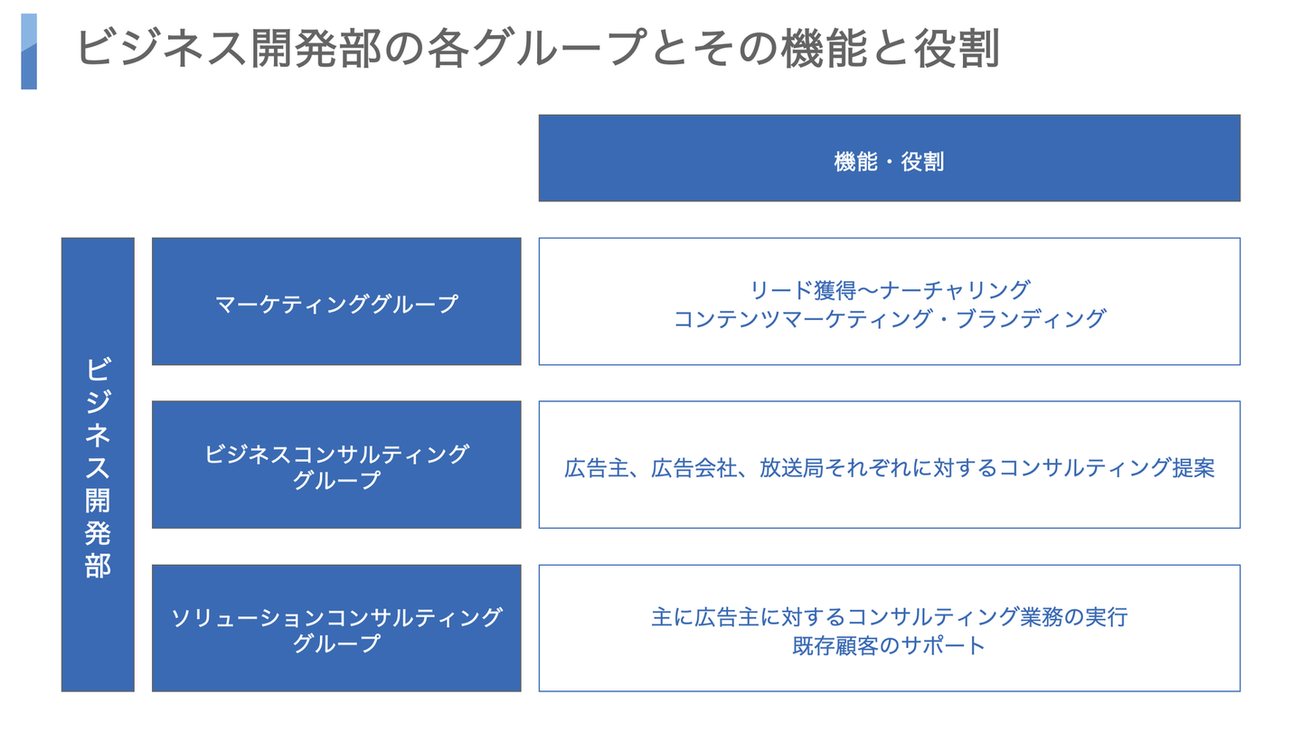 前田:ビジネス開発部は「マーケテインググループ」「ビジネスコンサルティンググループ」「ソリューションコンサルティンググループ」という3つのグループによって構成されています。いずれのグループもテレビCMを出稿している広告主であったり、広告会社や放送局などが主なお客様です。