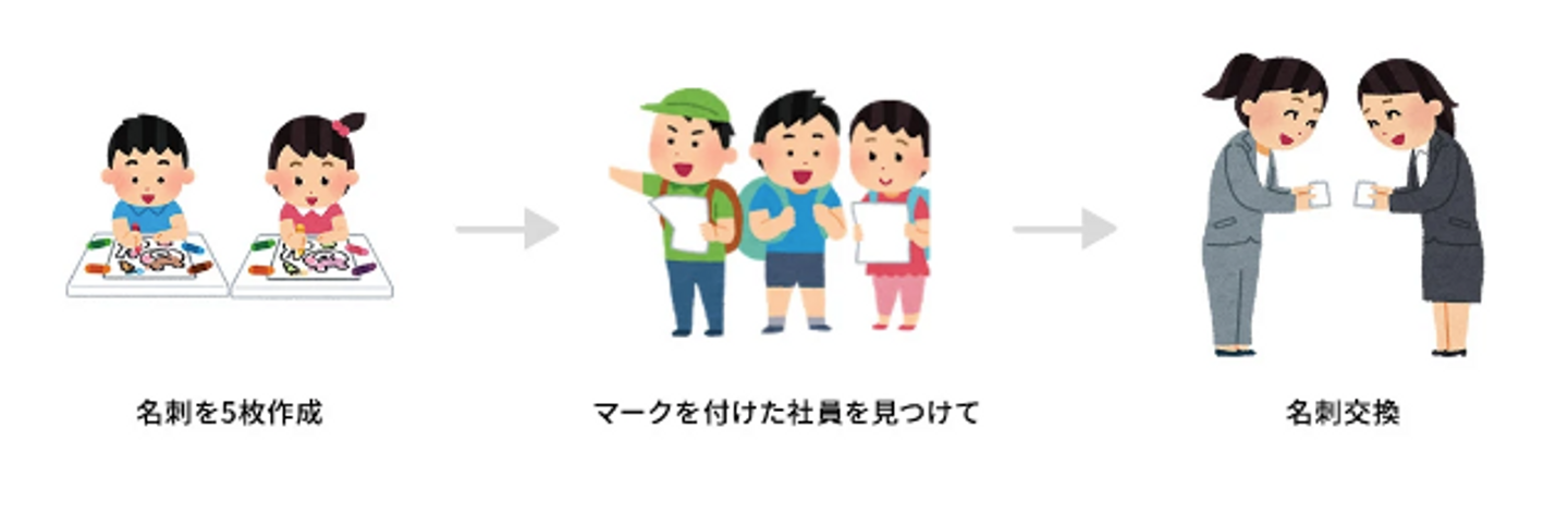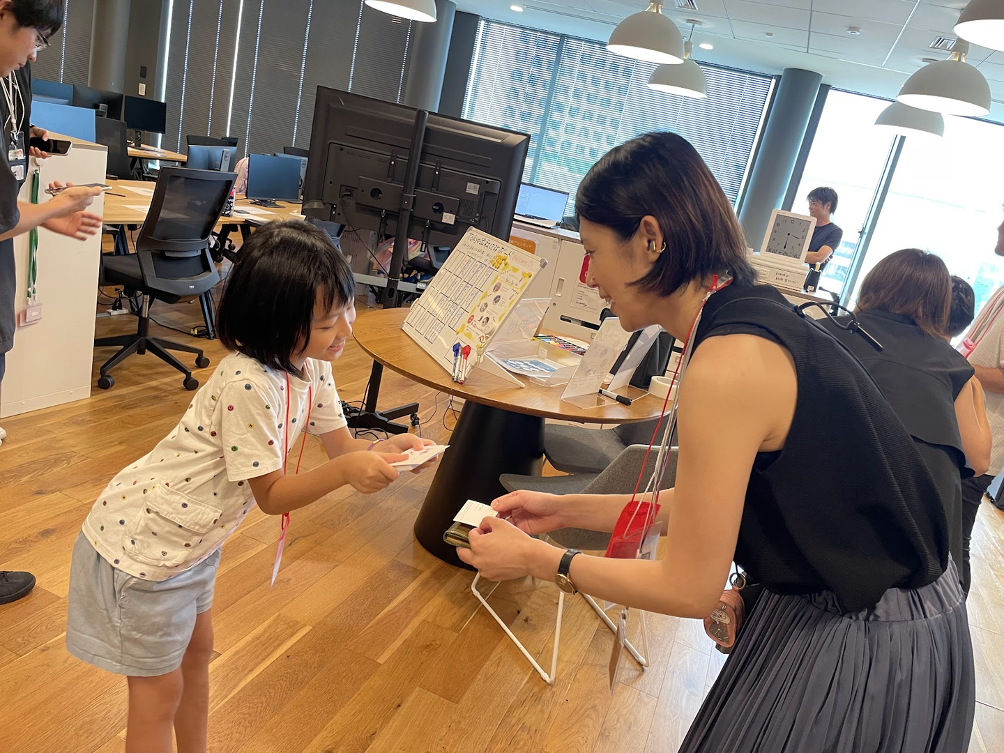 会社紹介のあと、子供たちは3チームに別れて、東京オフィスでは、「名刺を作ろう!」「WeWorkでチェックイン&荷物を受け取ろう!」「スタンプ(シール)ラリー」の3つのイベントを、順番に体験。