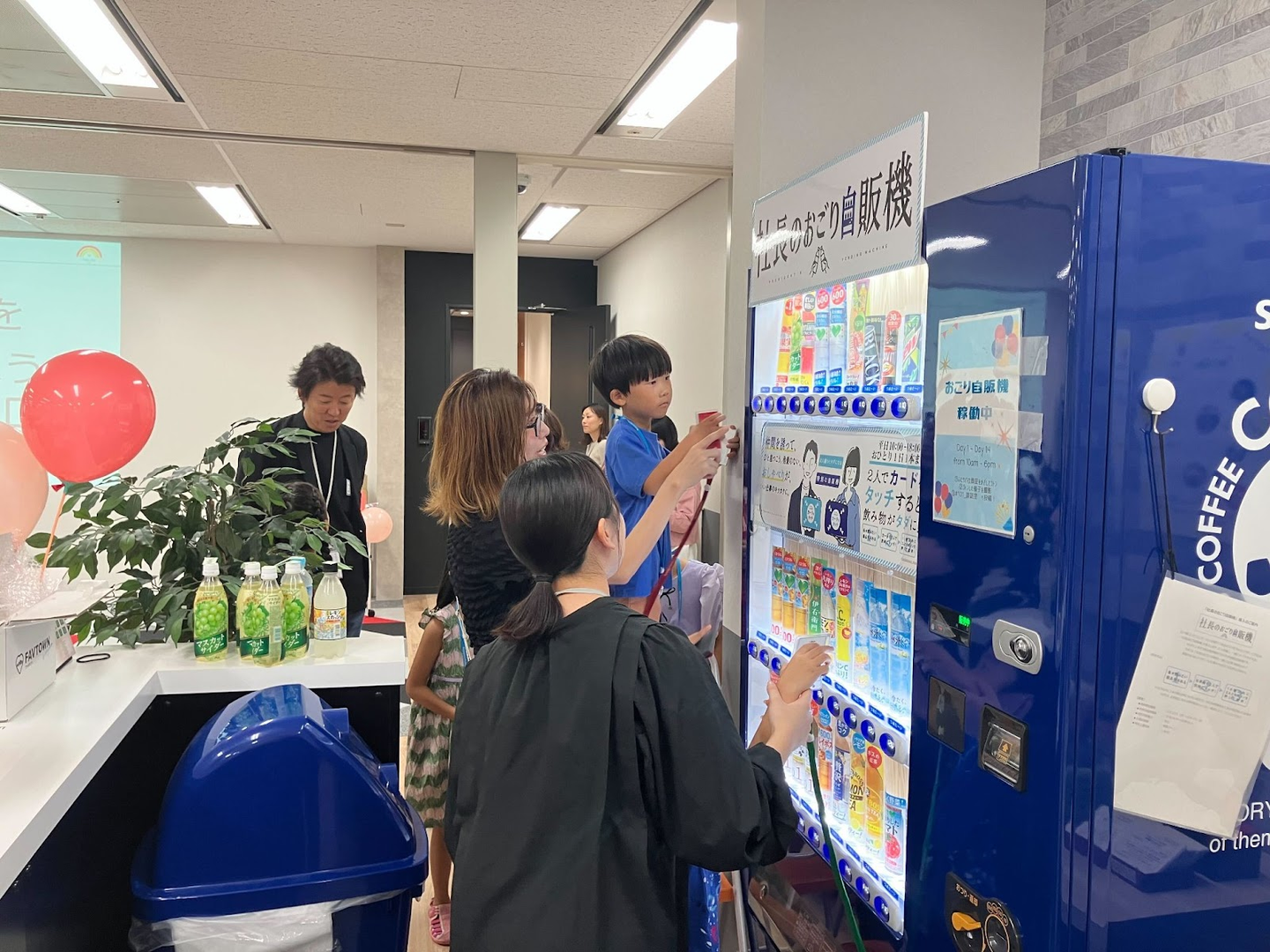 大阪オフィスでは、「ゴトン」の名称で親しまれている自販機を活用したコンテンツも体験してもらいました。ゴトンとは、「オフィスに設置されている自販機に2人でカードをかざし、それぞれが好きなドリンクを選んで購入ボタンを押すと、ドリンクを無料でゲットできる」という仕組みです!正式名称はサントリーさんの「社長のおごり自販機」で、社長の奢りでドリンクが飲める制度です。Family Day2024だけのコンテンツではなく、社員であれば通年で利用できます。