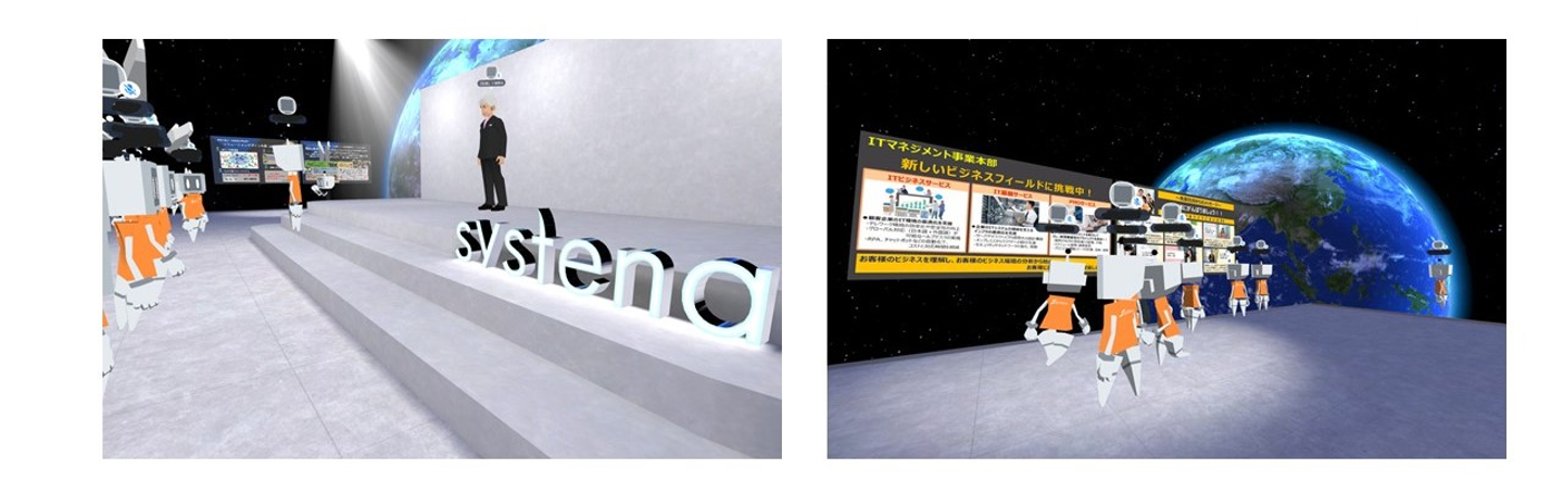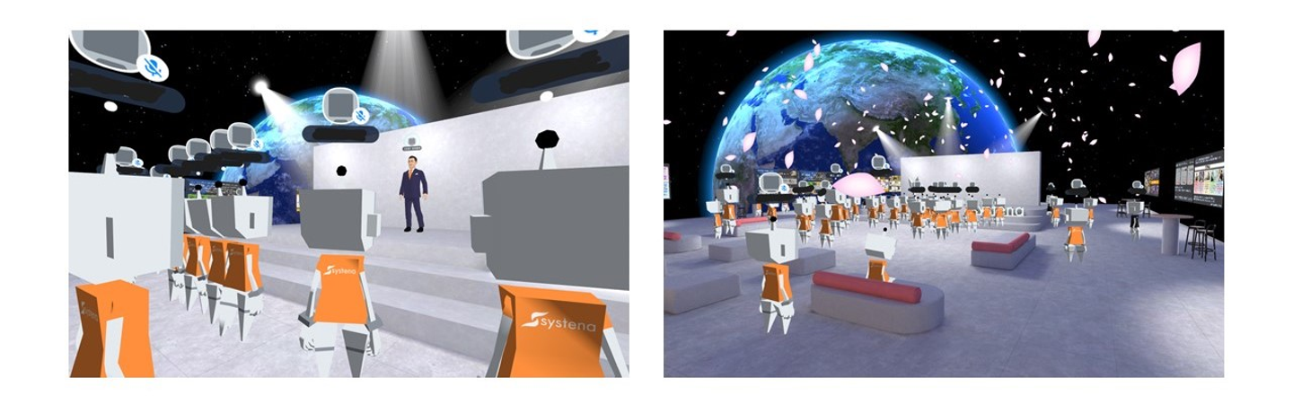 今回、メタバース空間は自社のカフェエリアを再現するだけでなく、それを宇宙空間の中に出現させ、そこに新入社員各々のアバターが集まり自由に歩き回りながら、自社のサービスを紹介する各事業部門のサインボードを博覧会のように見学できる演出としました。