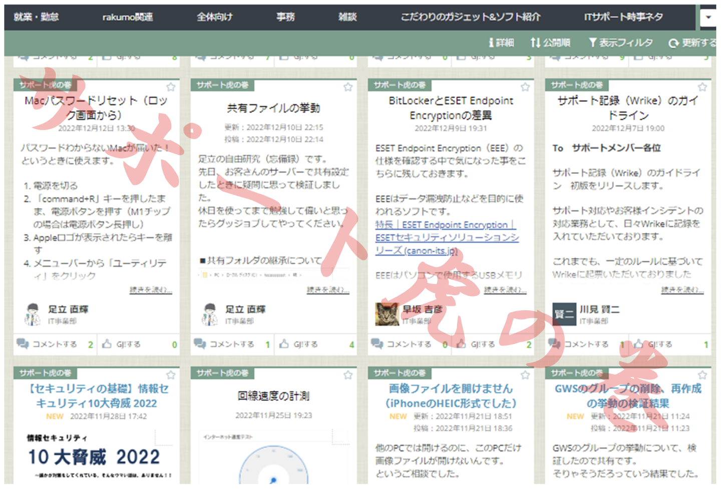 「rakumo」というアプリがありまして、様々な社内のノウハウや報告すべき事項などを格納、共有できます。