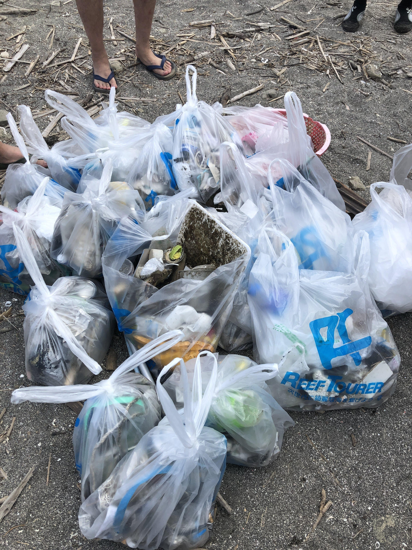 まずは自己紹介後、海水浴場のクリーン活動です!ごみの山・・・