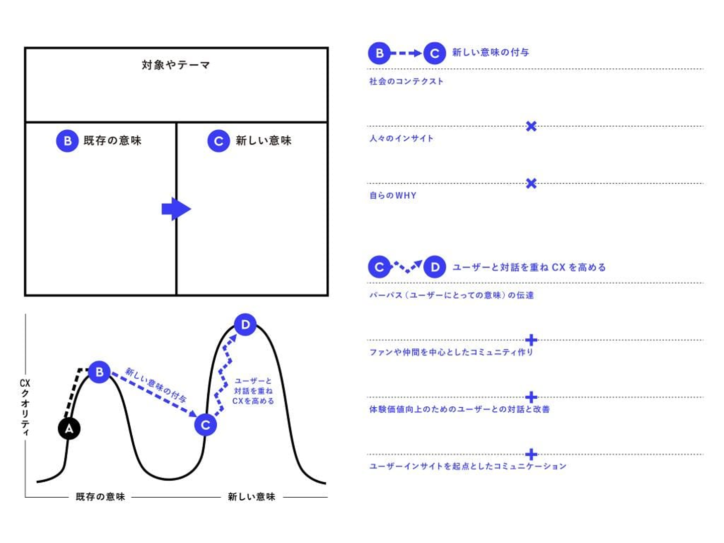 こうした理論を背景としてNEW STANDARDのアプローチをまとめたのが、「意味解釈の全体プロセス」の図になります。図のBからCに向かう際には、意味の解釈者として企業やブランドの新しいパーパスの策定を支援。その後のCからDに向かう際には、ユーザーとの対話やコミュニケーションを重ねながら、そのパーパスの組織内外への浸透を支援していきます。