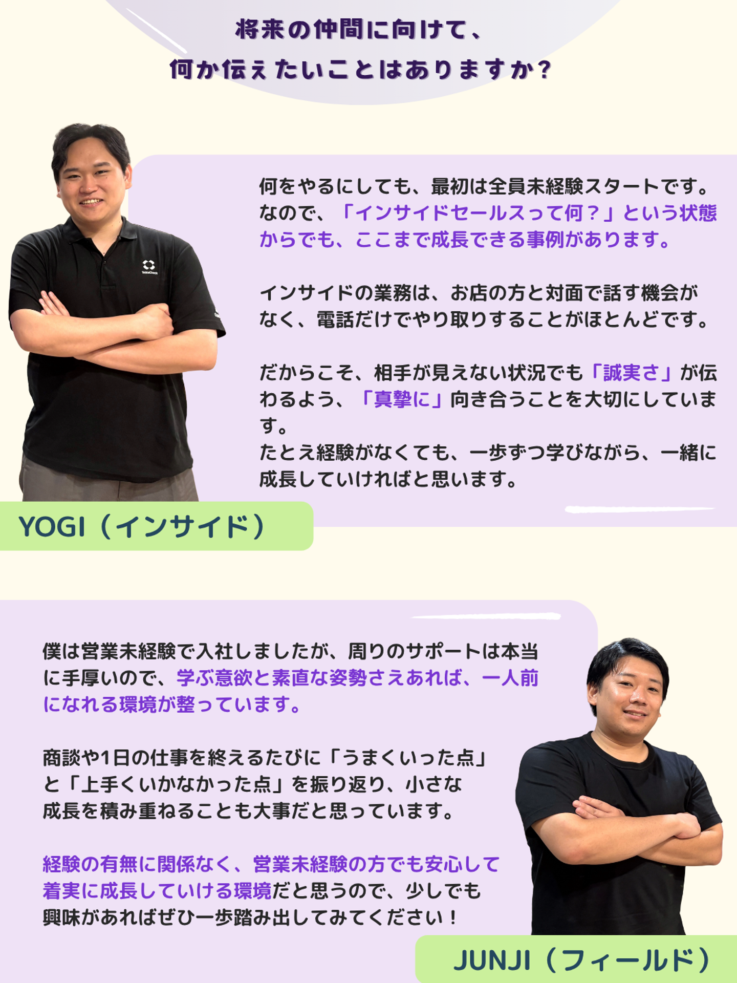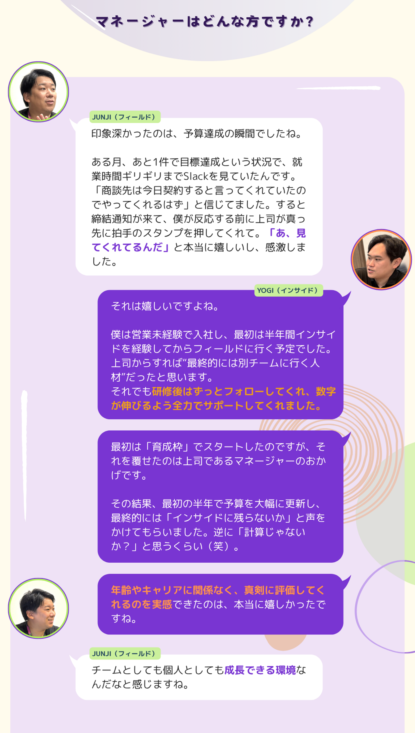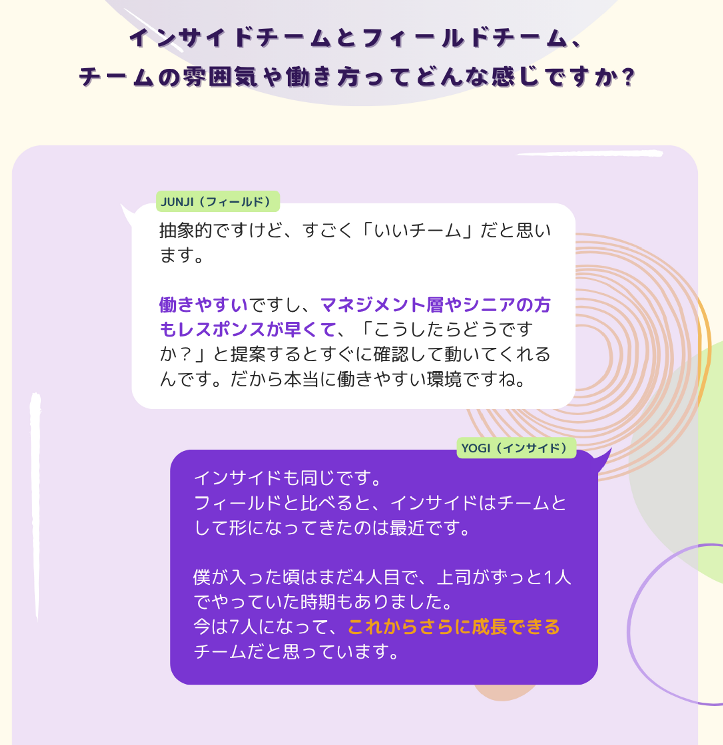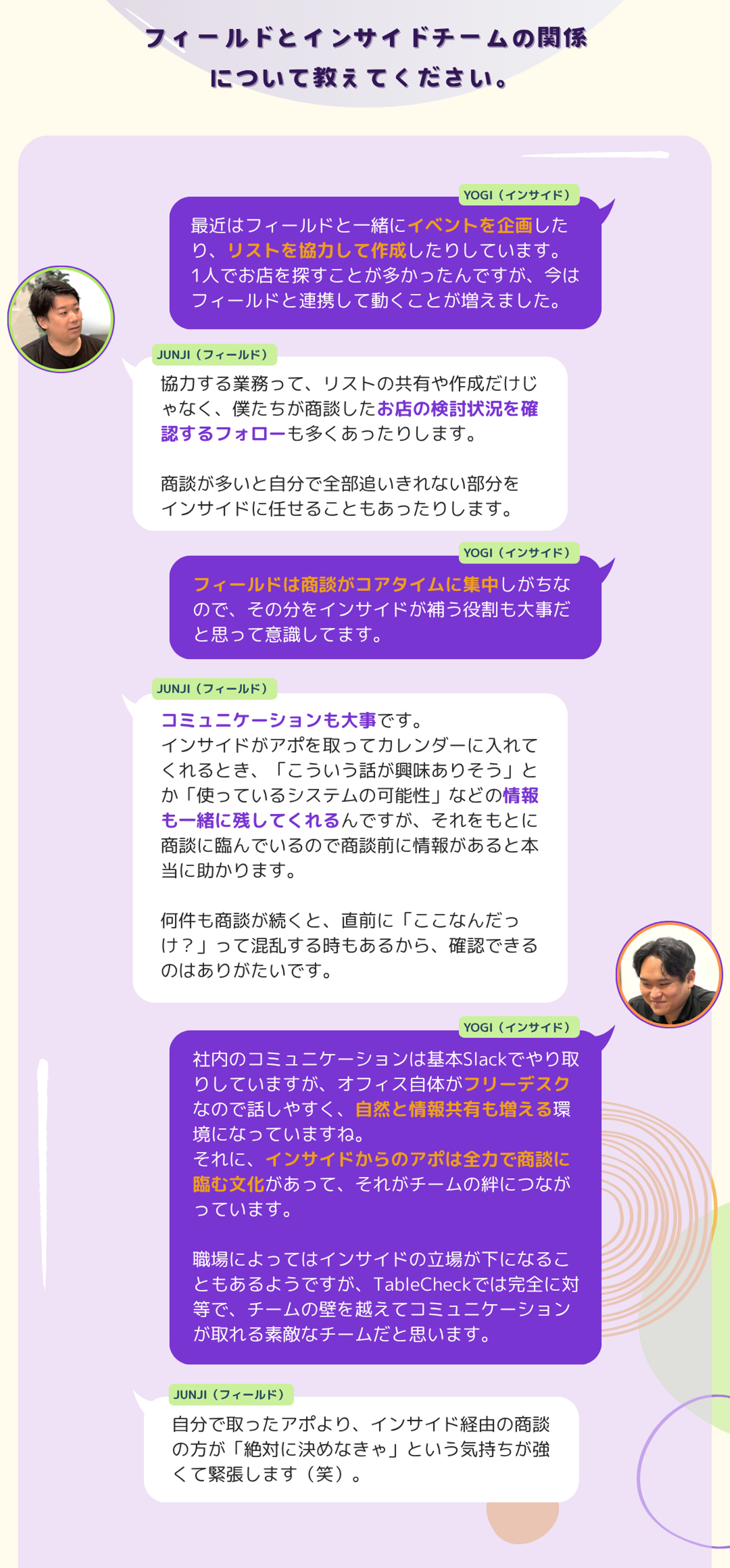 そこで今回は、フィールドとインサイドの現役メンバーをお招きして、業務内容やお互いの関係性、日々感じていることなどを、根掘り葉掘り聞いてみたいと思います。