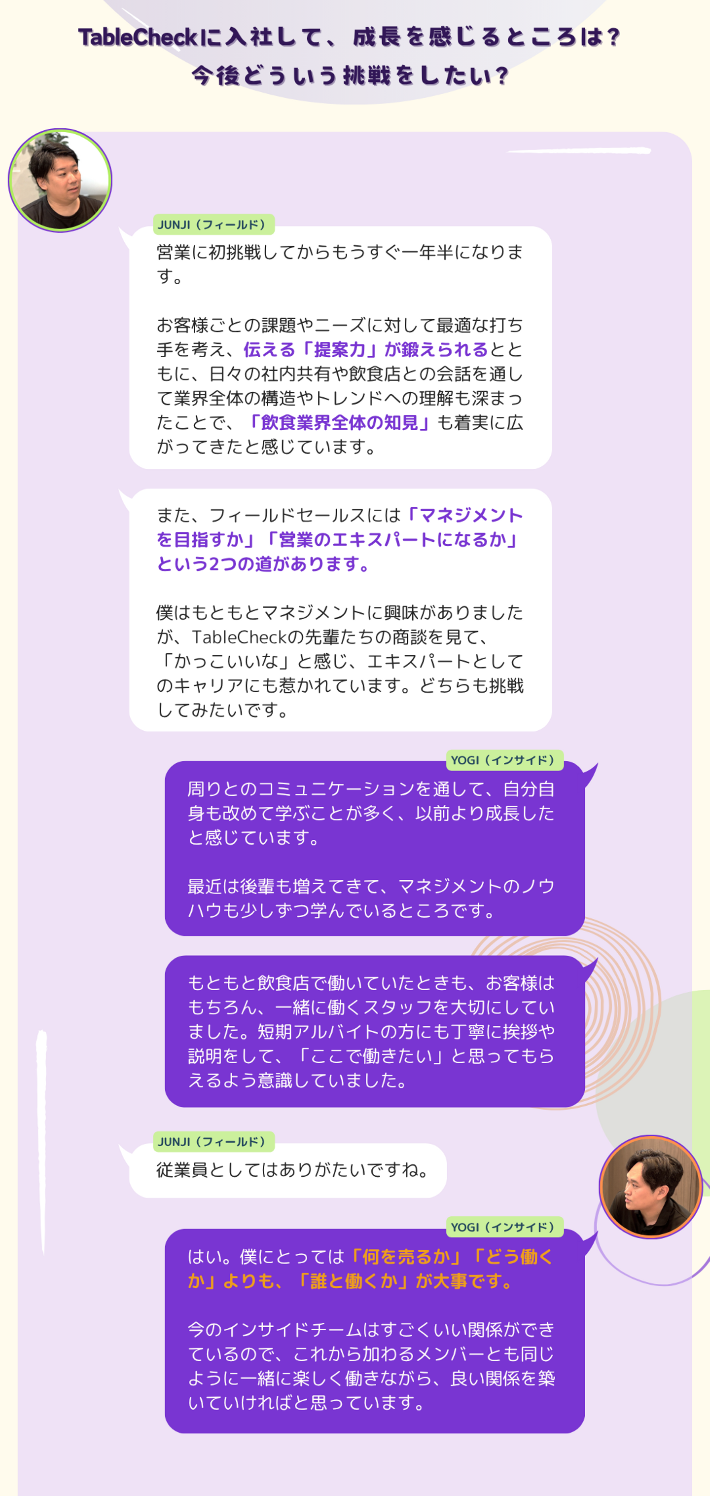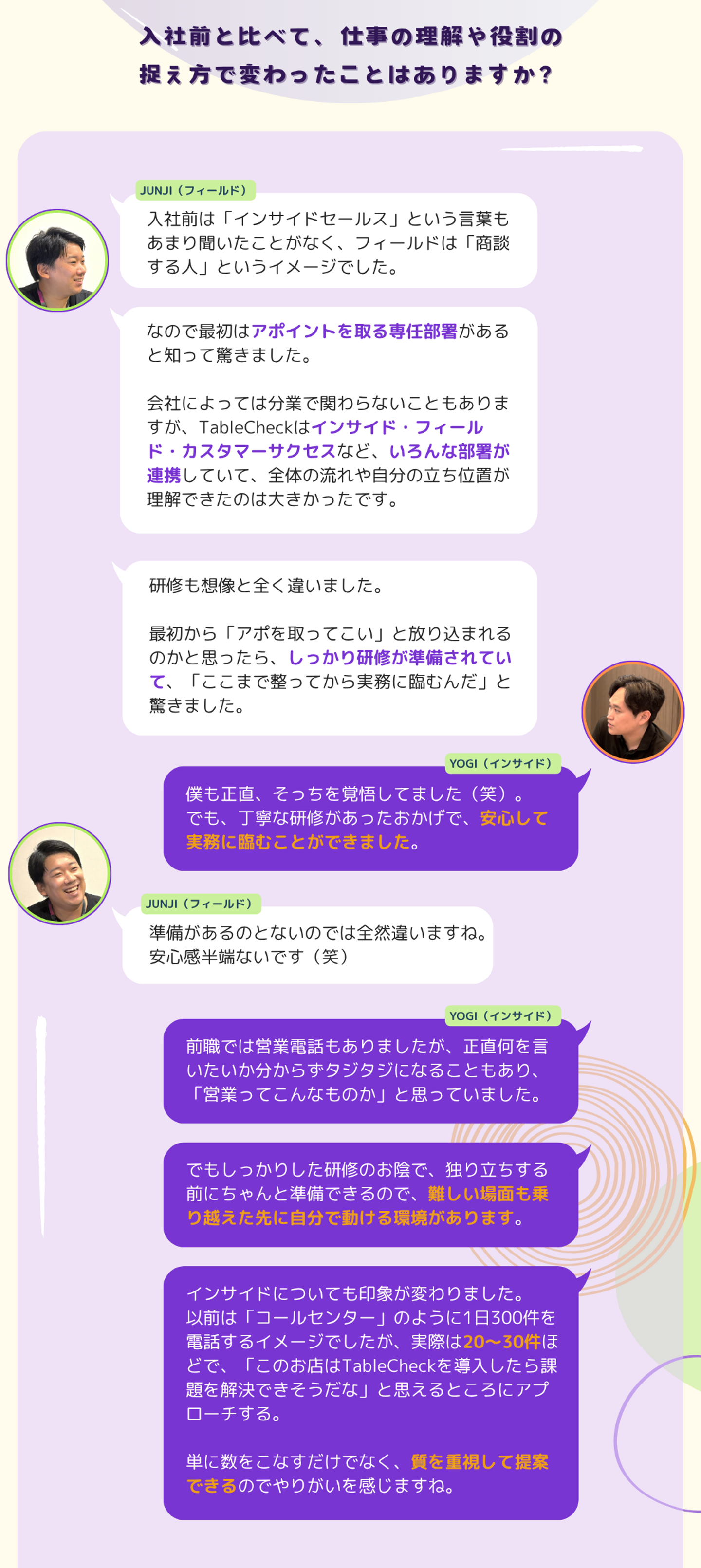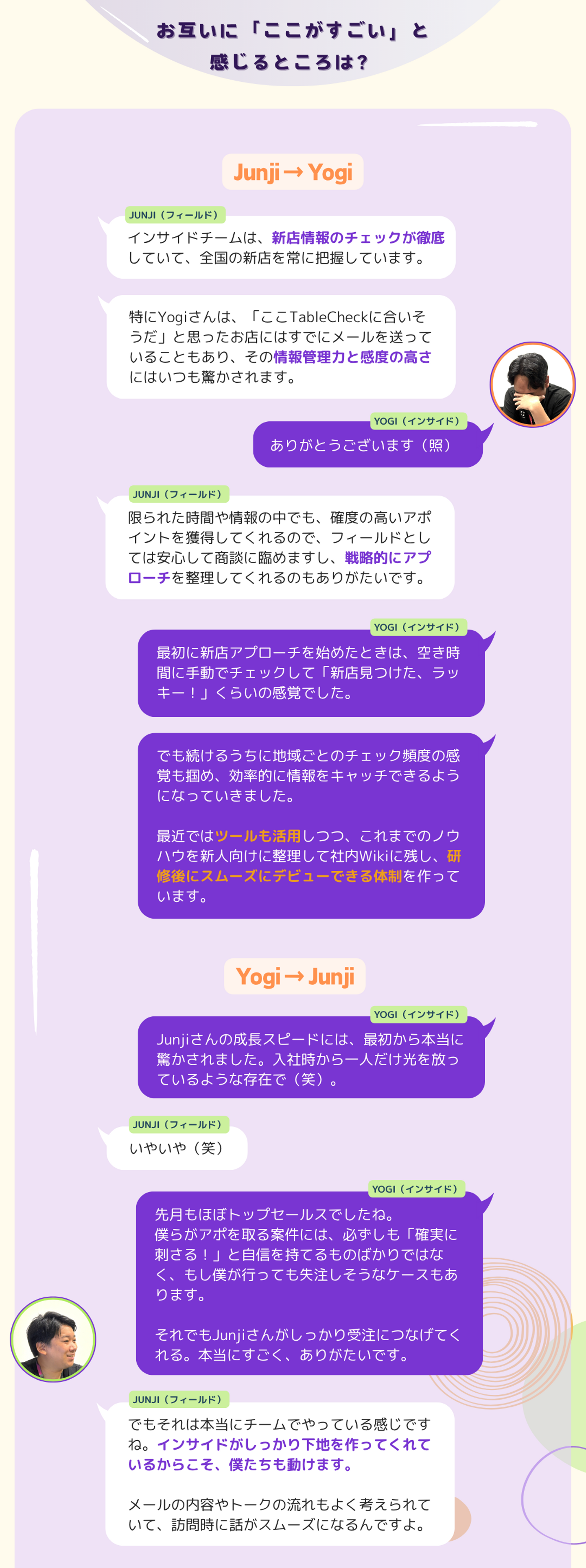 TableCheckの営業チームは、大きく「フィールド」と「インサイド」に分かれています。どちらも、より多くの飲食店に価値を届け、飲食業界を盛り上げるために日々努力しているメンバーです。