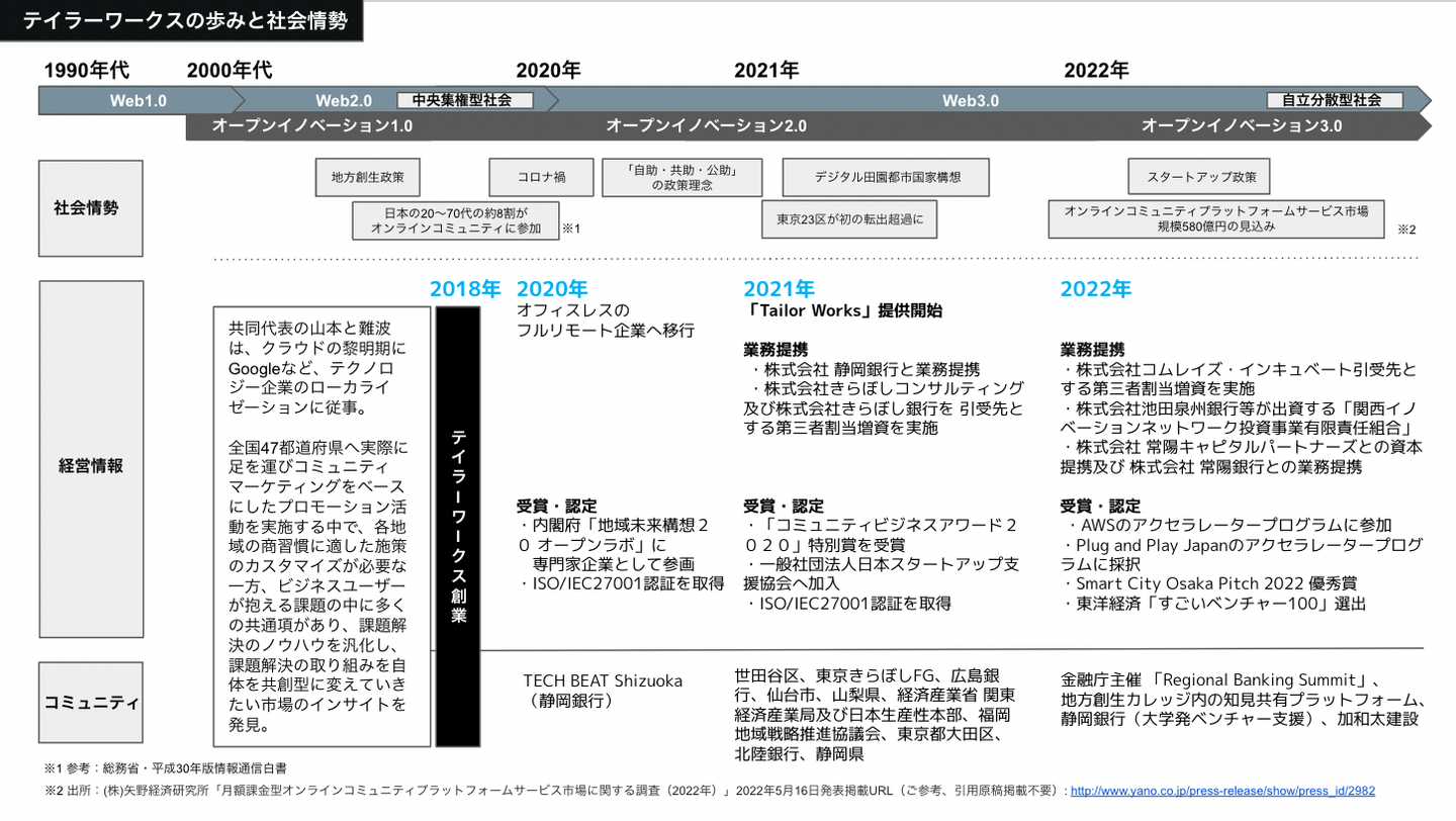 この記事では、テイラーワークスをはじめて知ったという方、「コミュニティ」を通じた産業活性化や新規事業創出、イノベーションについてもっと知りたいという方、「Tailor Works」って何? という方へ、私たちのやっていること、向かう先をお伝えできればと思います!