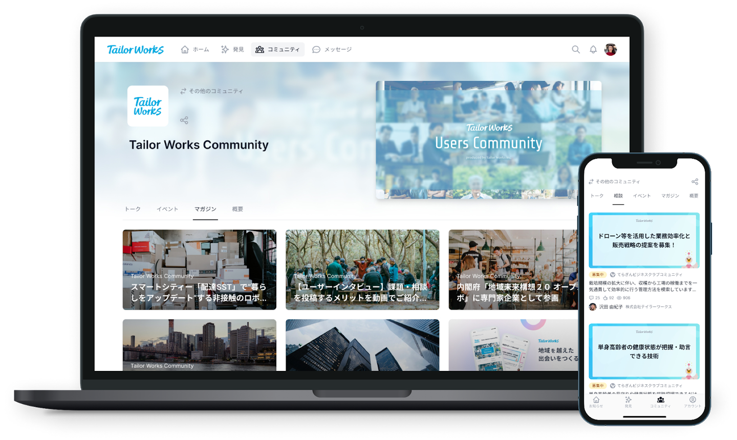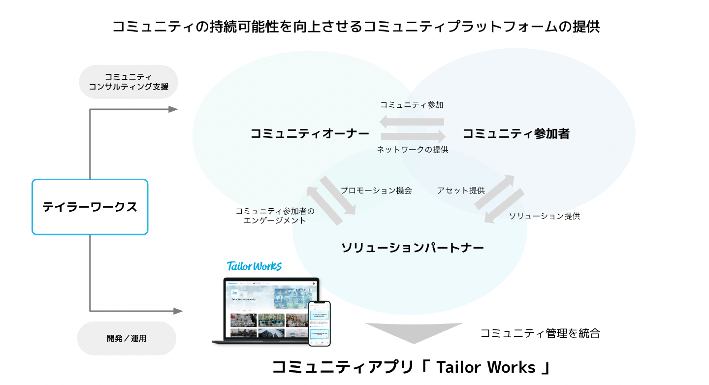 テイラーワークスは、コミュニティアプリ「 Tailor Works 」の提供を通じて、オンラインコミュニティで多様なステークホルダーとの情報や知見の共有を促進したり、信用に基づく新しいネットワーク構築をサポートします。