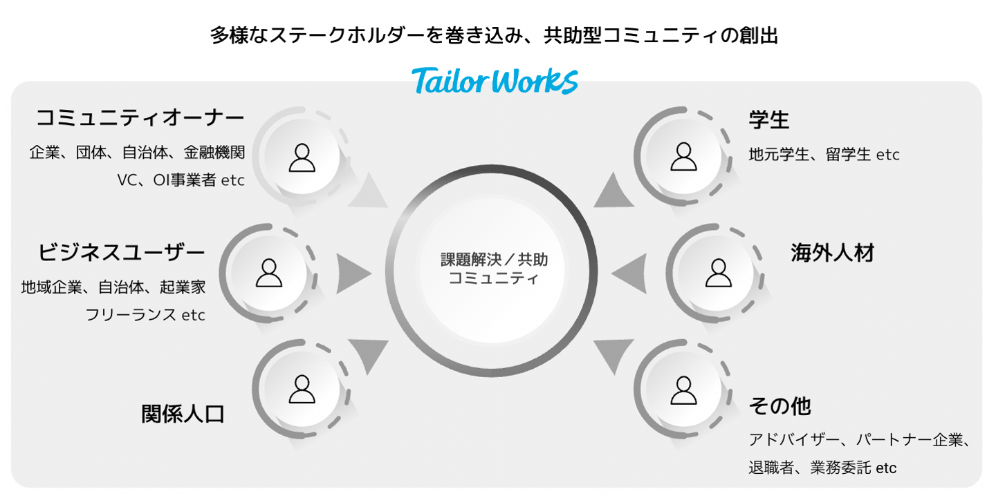 「 Tailor Works 」は、多様なステークホルダーを巻き込む持続可能な共助型コミュニティの創出によって、産業活性・エコシステム作りをサポートするコミュニティアプリです。