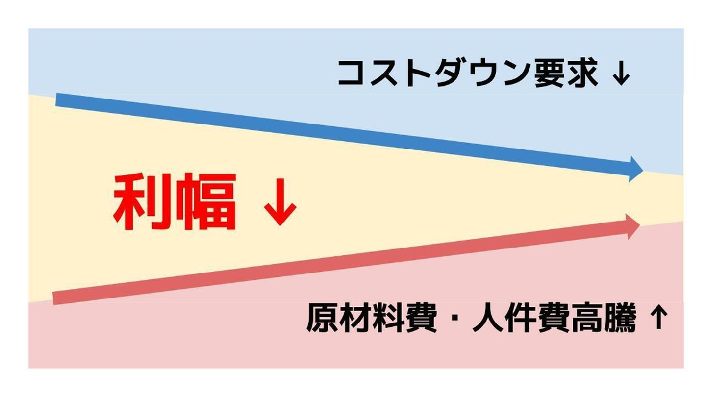 原価高騰とコストダウン要求の板挟みとなり、利幅が薄くなる構造