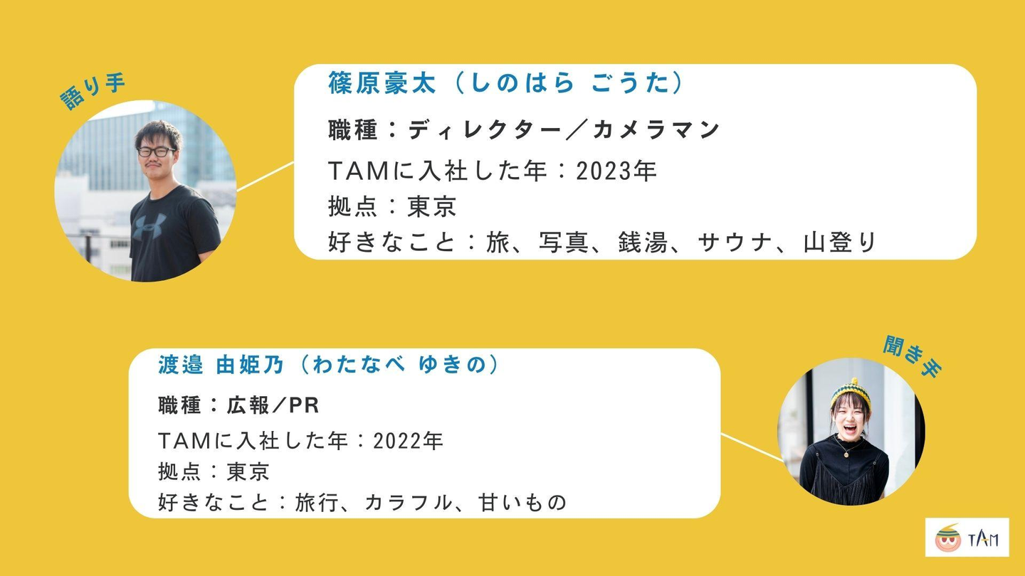 TAMメンバーにインタビューする「TAMのお仕事図鑑」シリーズ。今回はしゃかいか! チームで、ディレクター&カメラマンとして働く篠原さんにお話を伺いました。