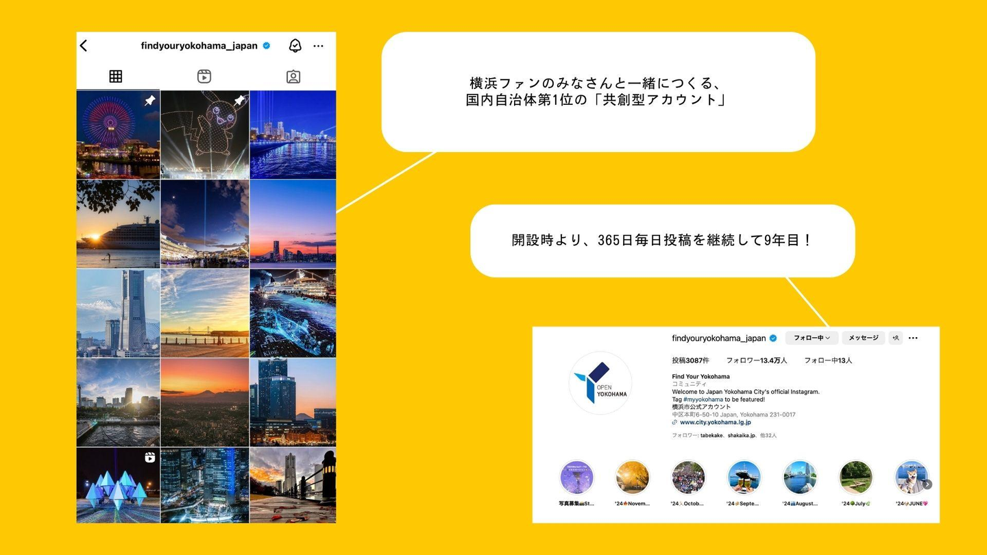 大きく3つに分られます。1つがSNSのコンテンツ企画制作。ゼロベースからどんなコンテンツを発信するのがよいかクライアントさんと一緒に考え、チームで撮影・制作を担当しています。もう1つがSNSの運用代行。こちらはクライアントさんのご要望に合わせることが多いですが、投稿スケジュールを作って管理するなど、運用がメインのお仕事です。例えば横浜市様の公式InstagramアカウントFind Your Yokohama( @findyouryokohama_japan )は、365日毎日更新しています。